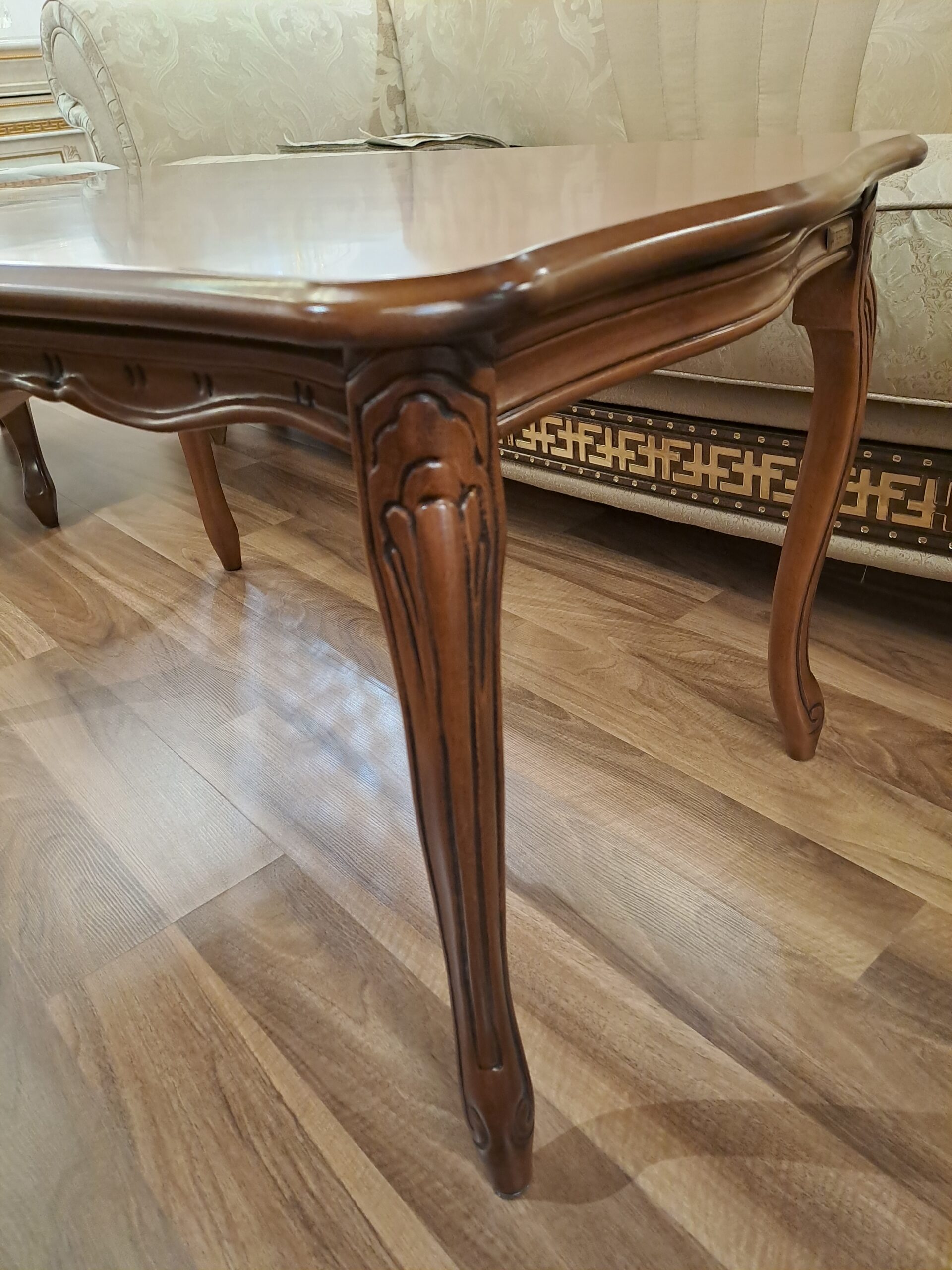 Dodaj odrobinę włoskiego szyku do swojego wnętrza dzięki naszemu stolikowi kawowemu w kolorze orzecha. Solidny, fornirowany blat o gładkiej powierzchni doskonale prezentuje się w każdym salonie, łącząc funkcjonalność z estetyką. Niezwykle efektowne rzeźbione nóżki wykonane z drewna bukowego podkreślają elegancki charakter mebla i nadają mu klasyczny, ponadczasowy wygląd.