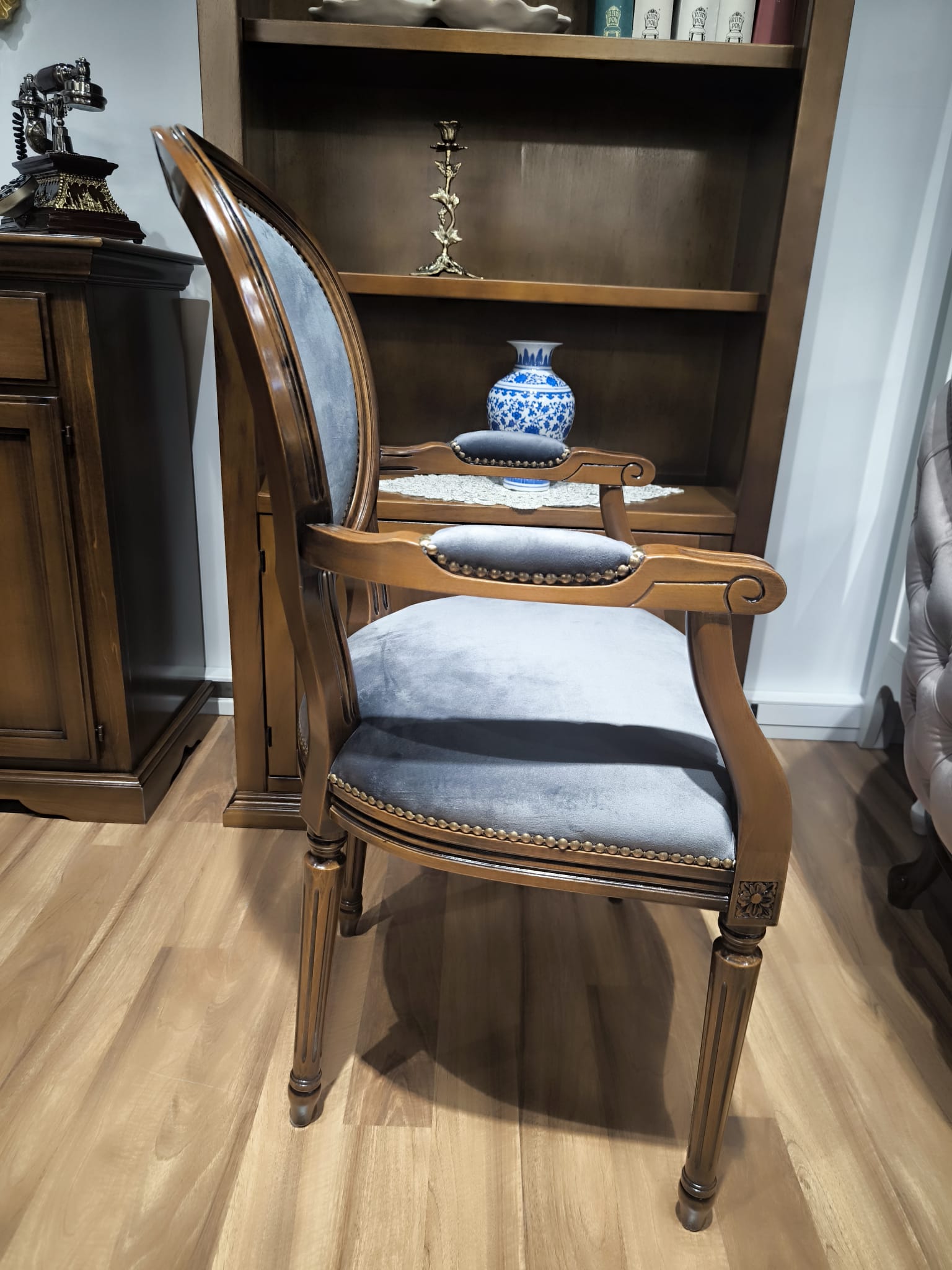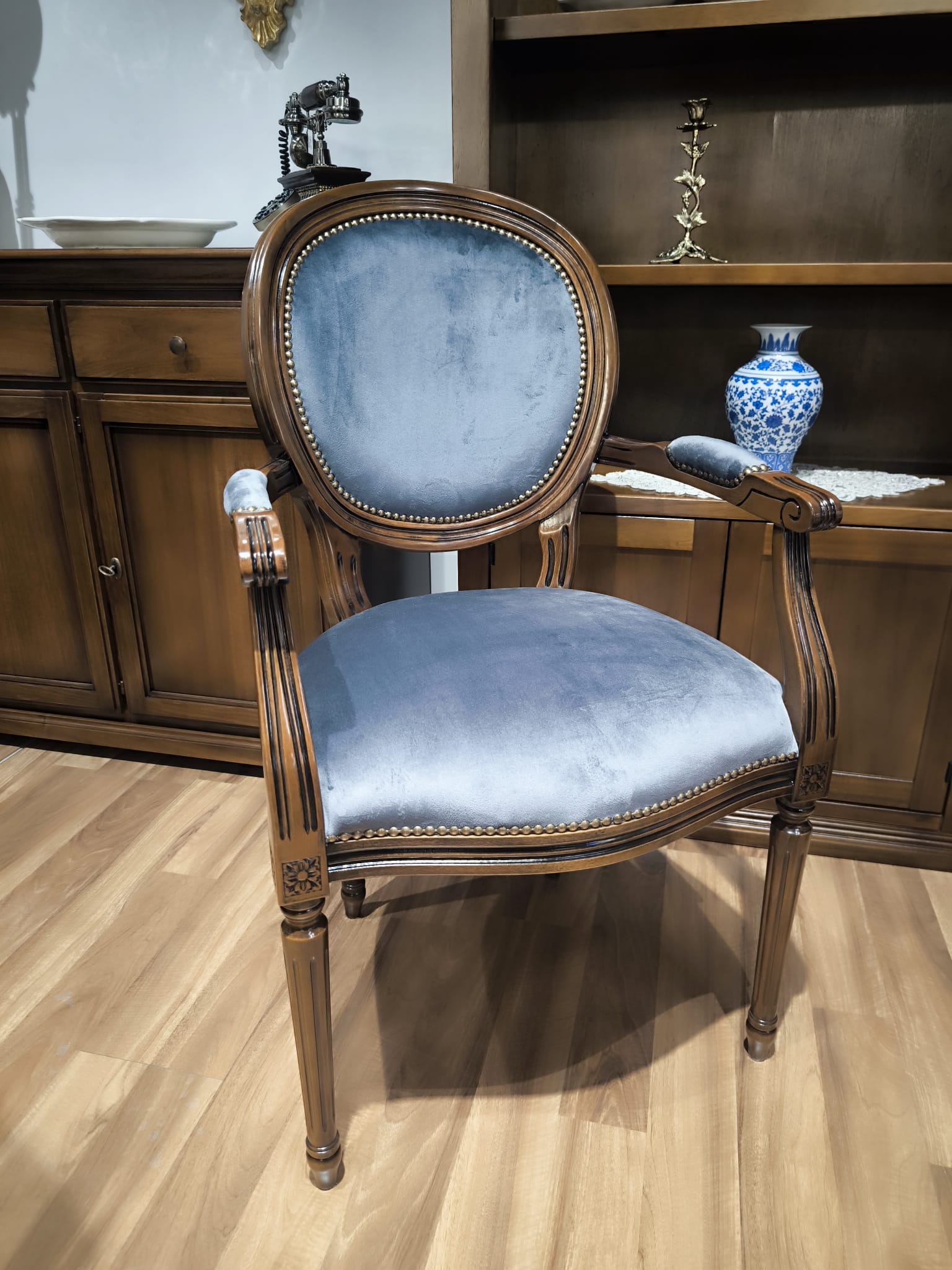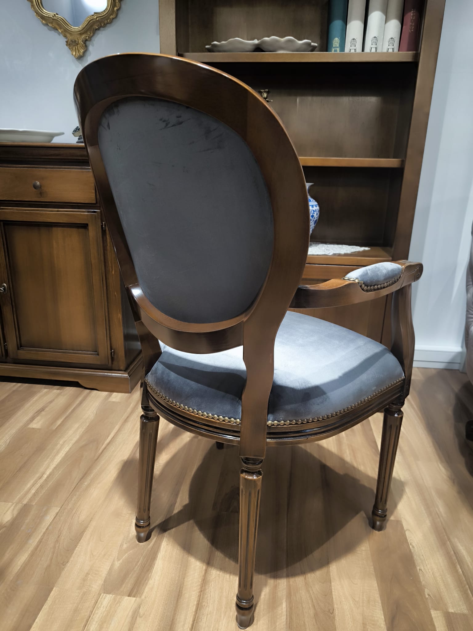 Eleganckie krzesło z podłokietnikami 25/K łączy klasyczny styl Ludwika XVI z trwałością i komfortem współczesnego mebla. Wykonany z litego drewna bukowego, barwionego na średni orzech z patyną, fotelik zachwyca precyzją wykonania. Welur w kolorze antracytowym o wysokiej odporności na ścieranie zapewnia trwałą i wygodną tapicerkę. Podłokietniki wyściełane, a całość ozdobiona pineskami w kolorze starego złota, nadaje meblowi elegancki, luksusowy charakter.