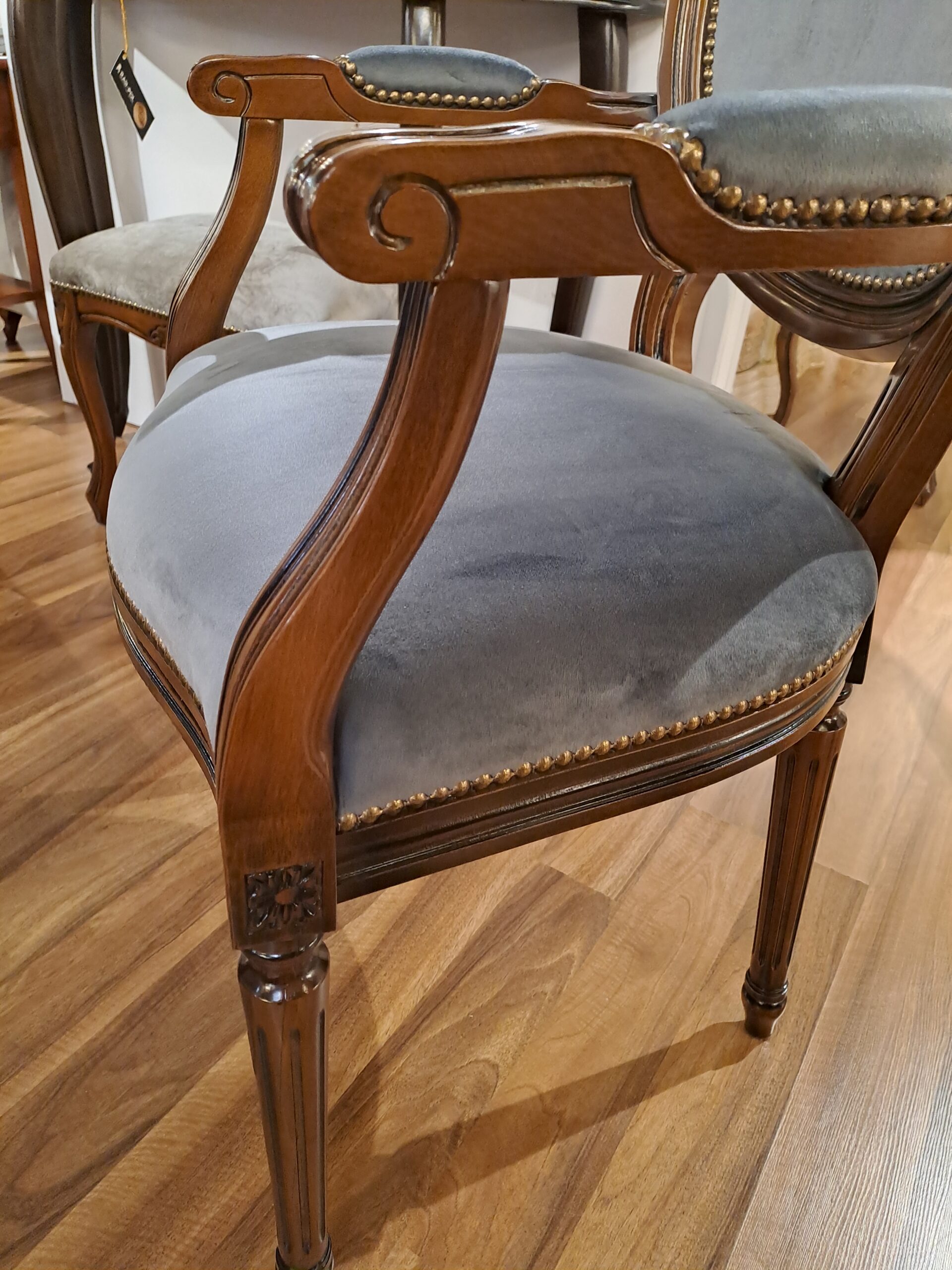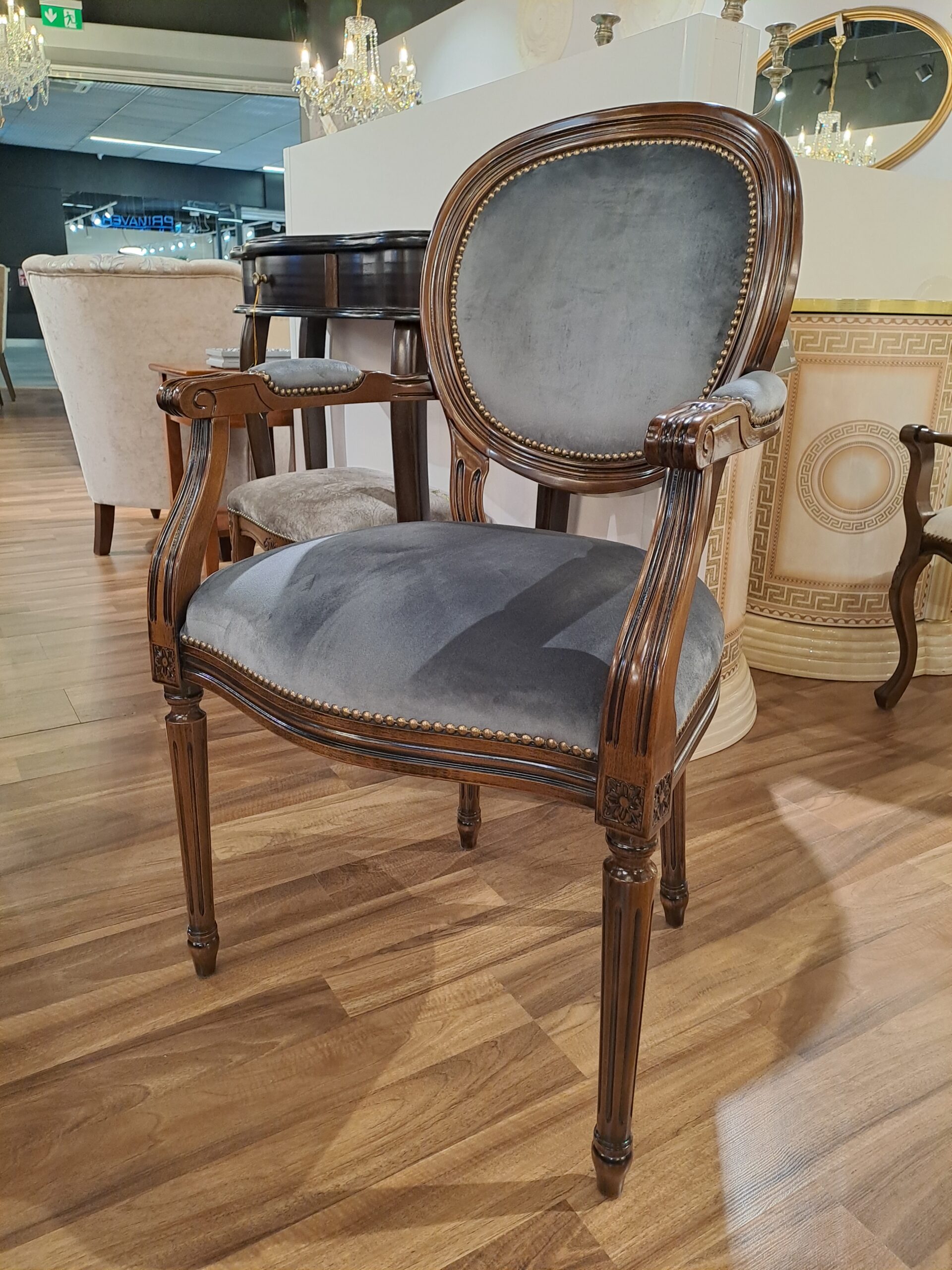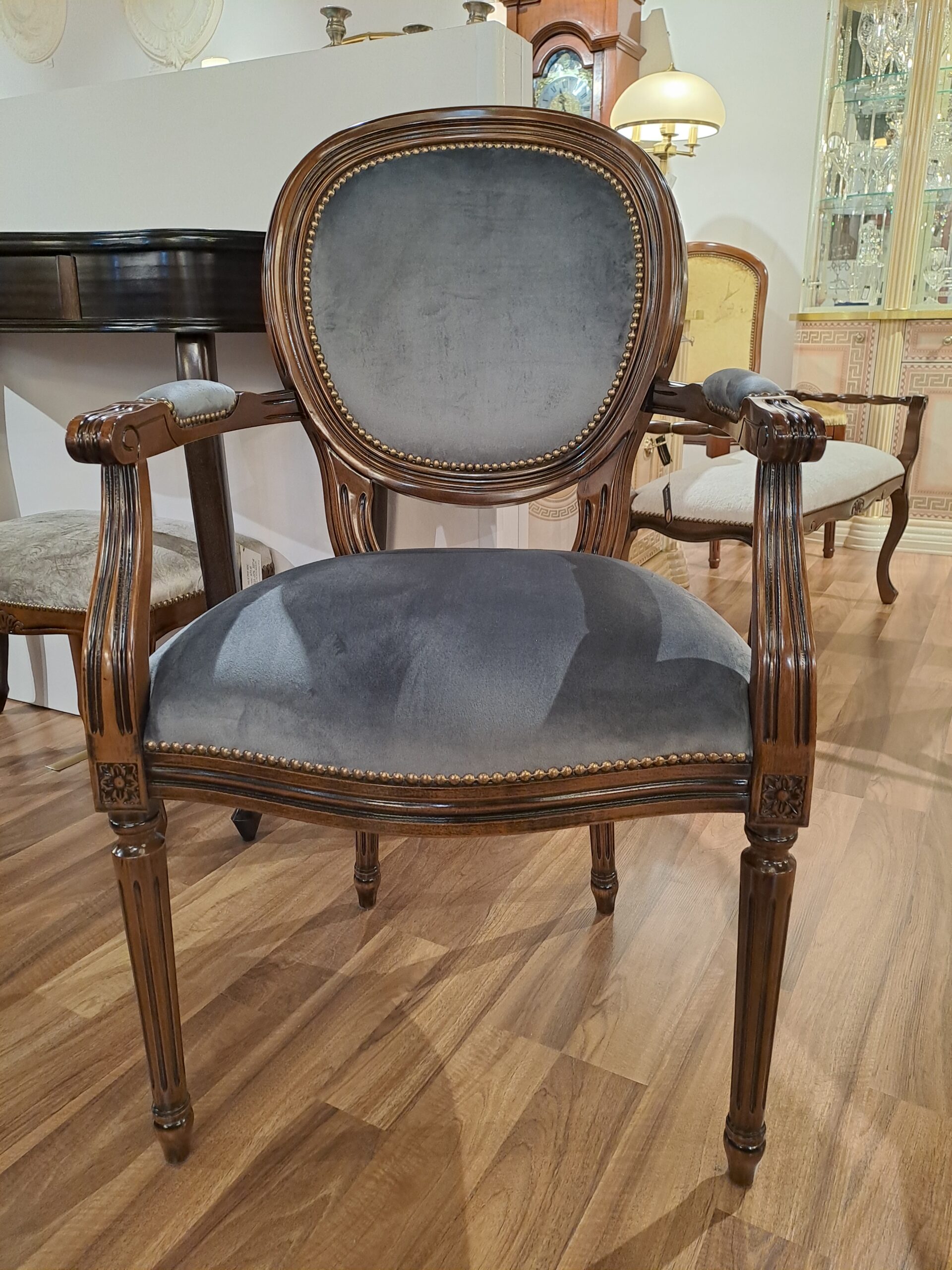 Elegancki fotelik 25/K łączy klasyczny styl Ludwika XVI z trwałością i komfortem współczesnego mebla. Wykonany z litego drewna bukowego, barwionego na średni orzech z patyną, fotelik zachwyca precyzją wykonania. Welur w kolorze antracytowym o wysokiej odporności na ścieranie zapewnia trwałą i wygodną tapicerkę. Podłokietniki wyściełane, a całość ozdobiona pineskami w kolorze starego złota, nadaje meblowi elegancki, luksusowy charakter.