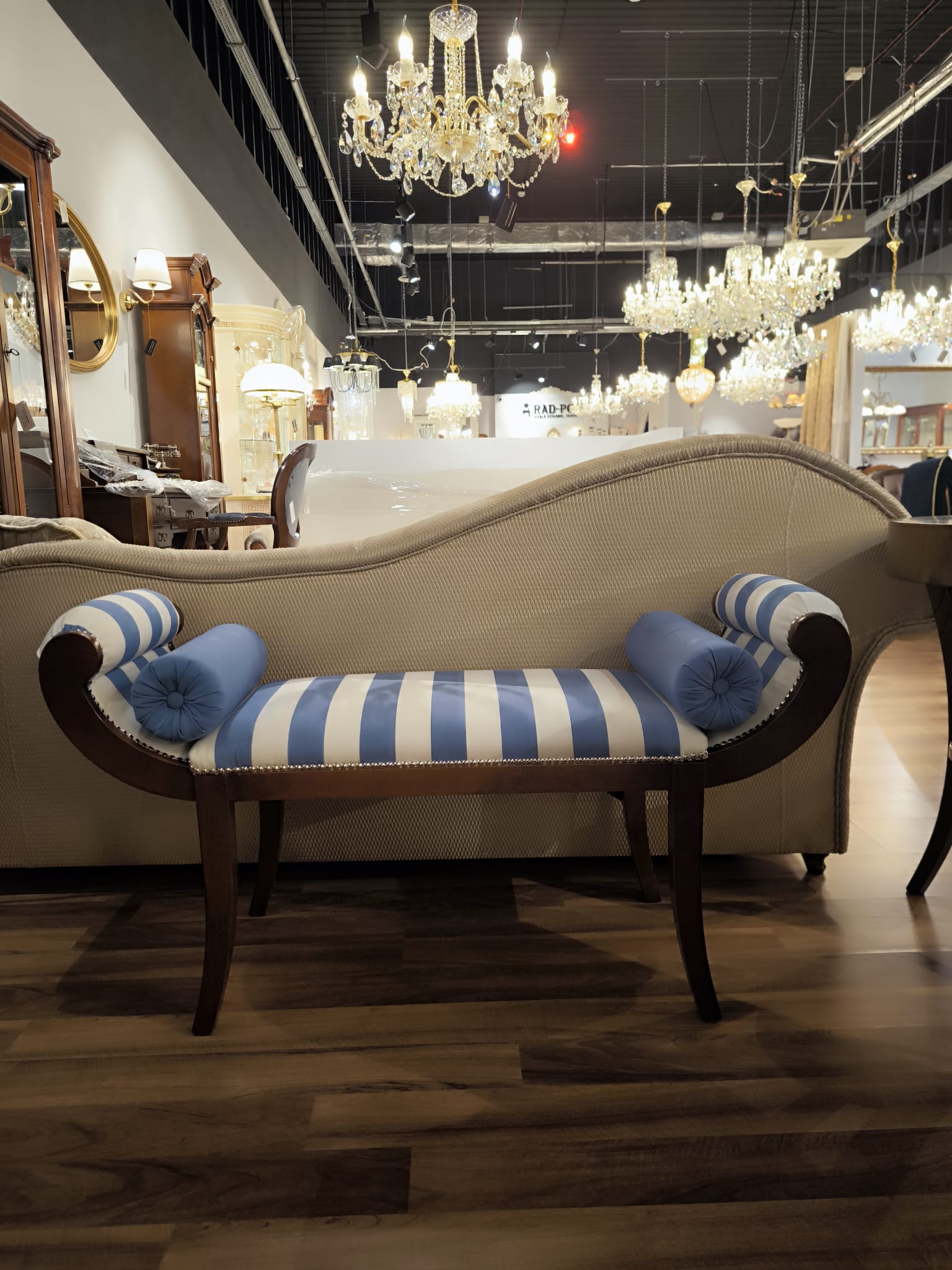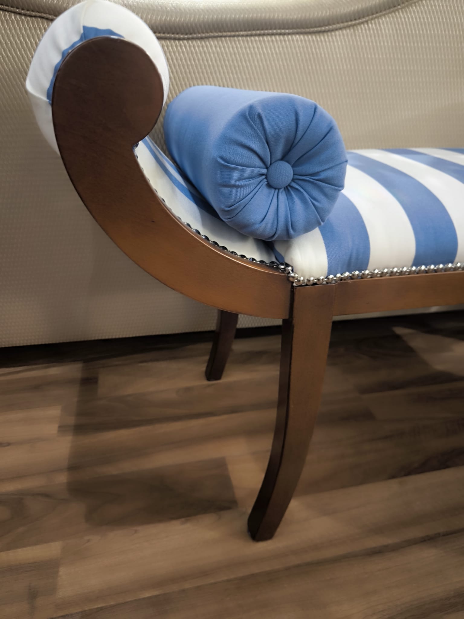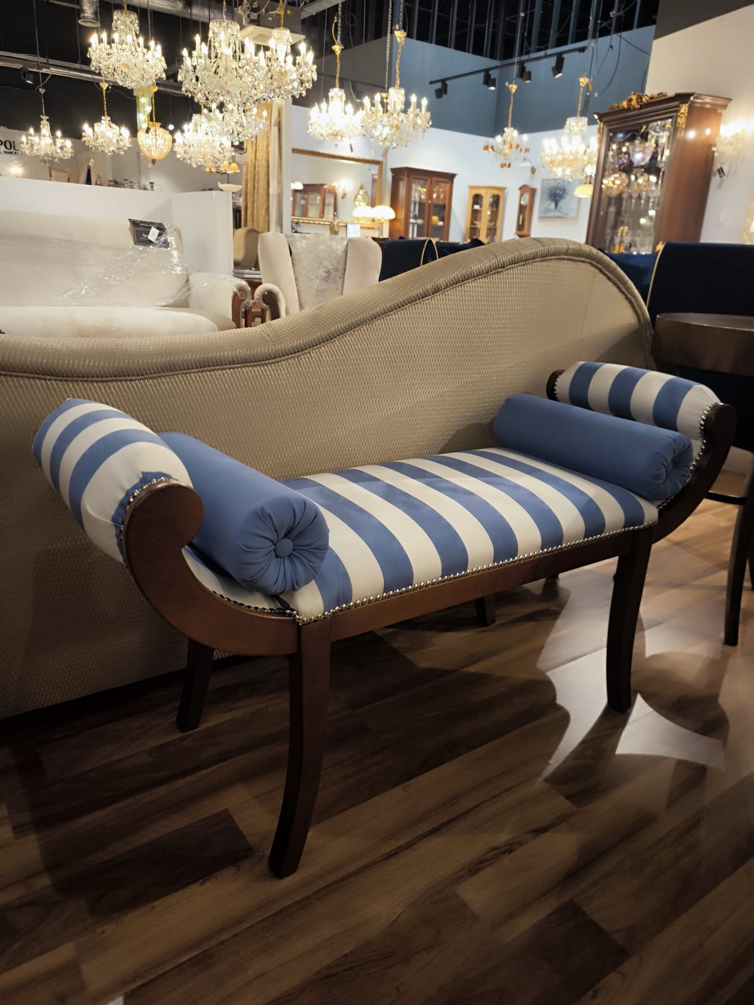 Ławeczka 95/K to stylowy mebel, który doda szyku każdemu wnętrzu. Jej solidna, drewniana konstrukcja w ciemnym wybarwieniu doskonale współgra z tapicerką w biało-niebieskie pasy, tworząc harmonijne połączenie klasyki i świeżości. Charakterystyczne, wygięte podłokietniki z dekoracyjnymi wałeczkami podkreślają jej elegancki charakter, a subtelne zdobienia w postaci pinezek tapicerskich dodają całości wyrafinowanego wykończenia.