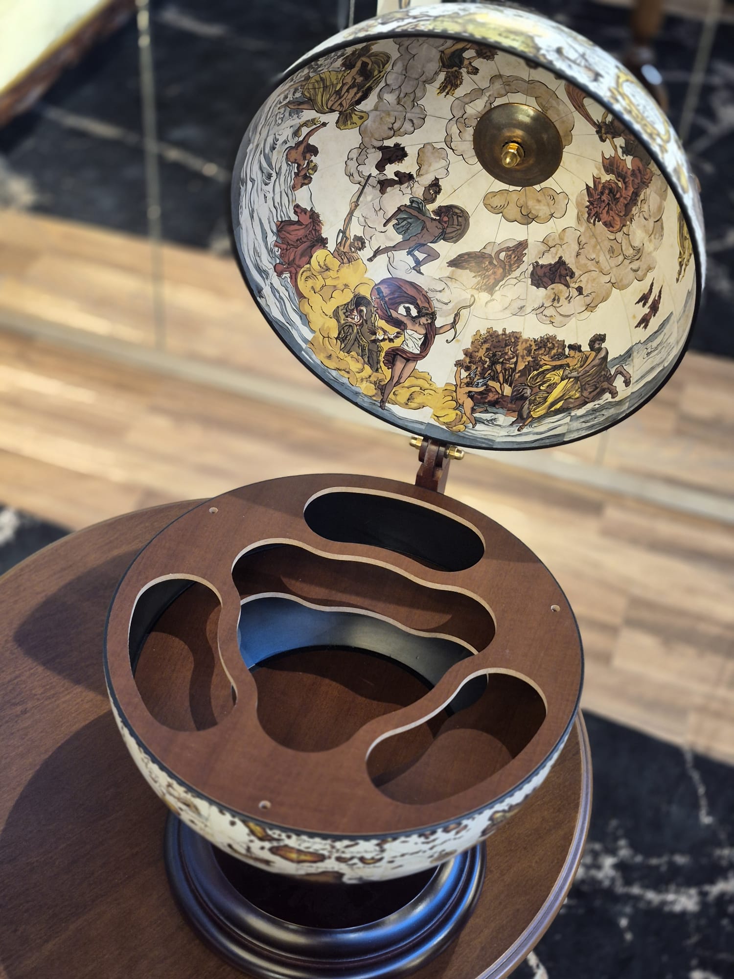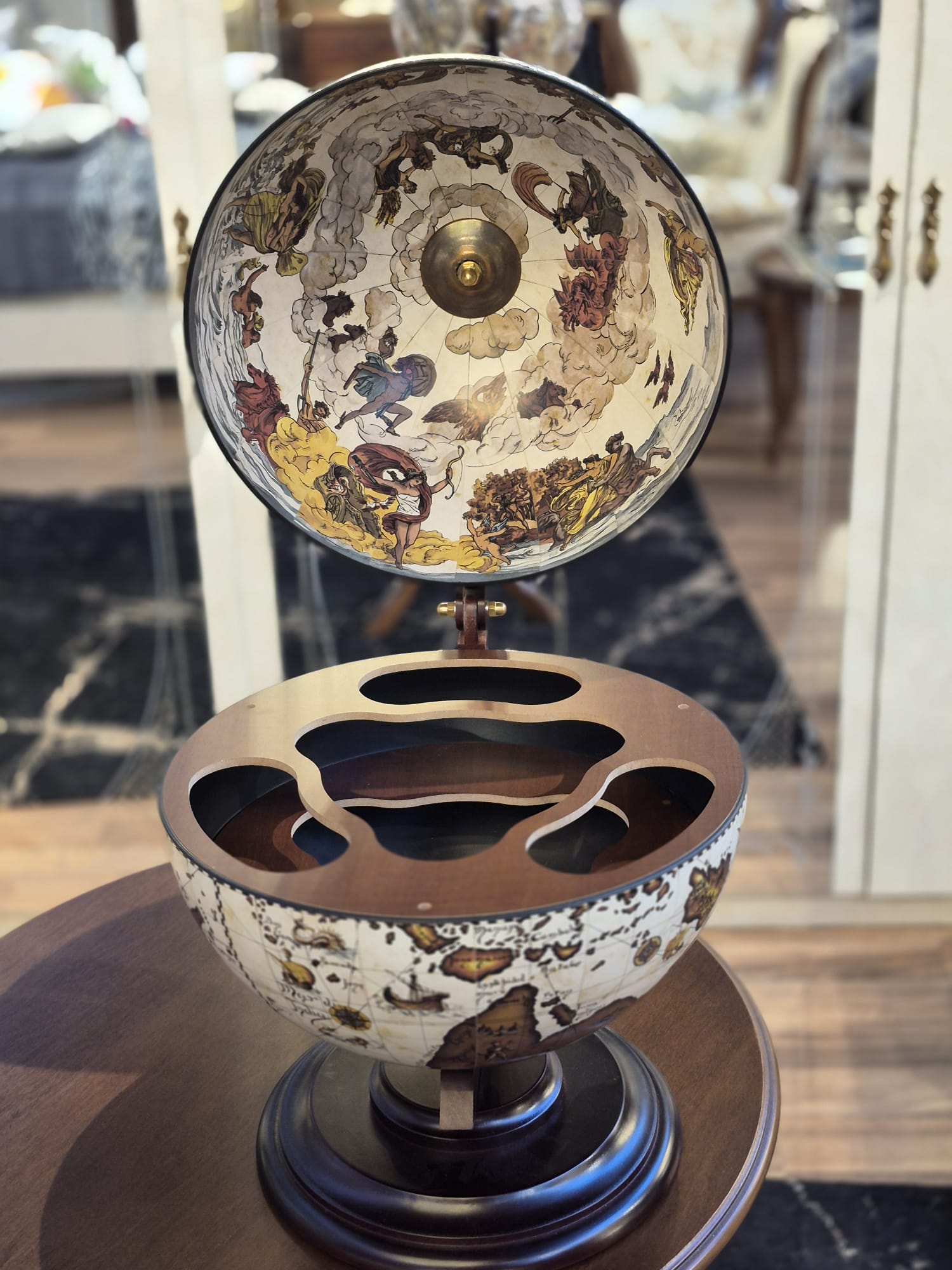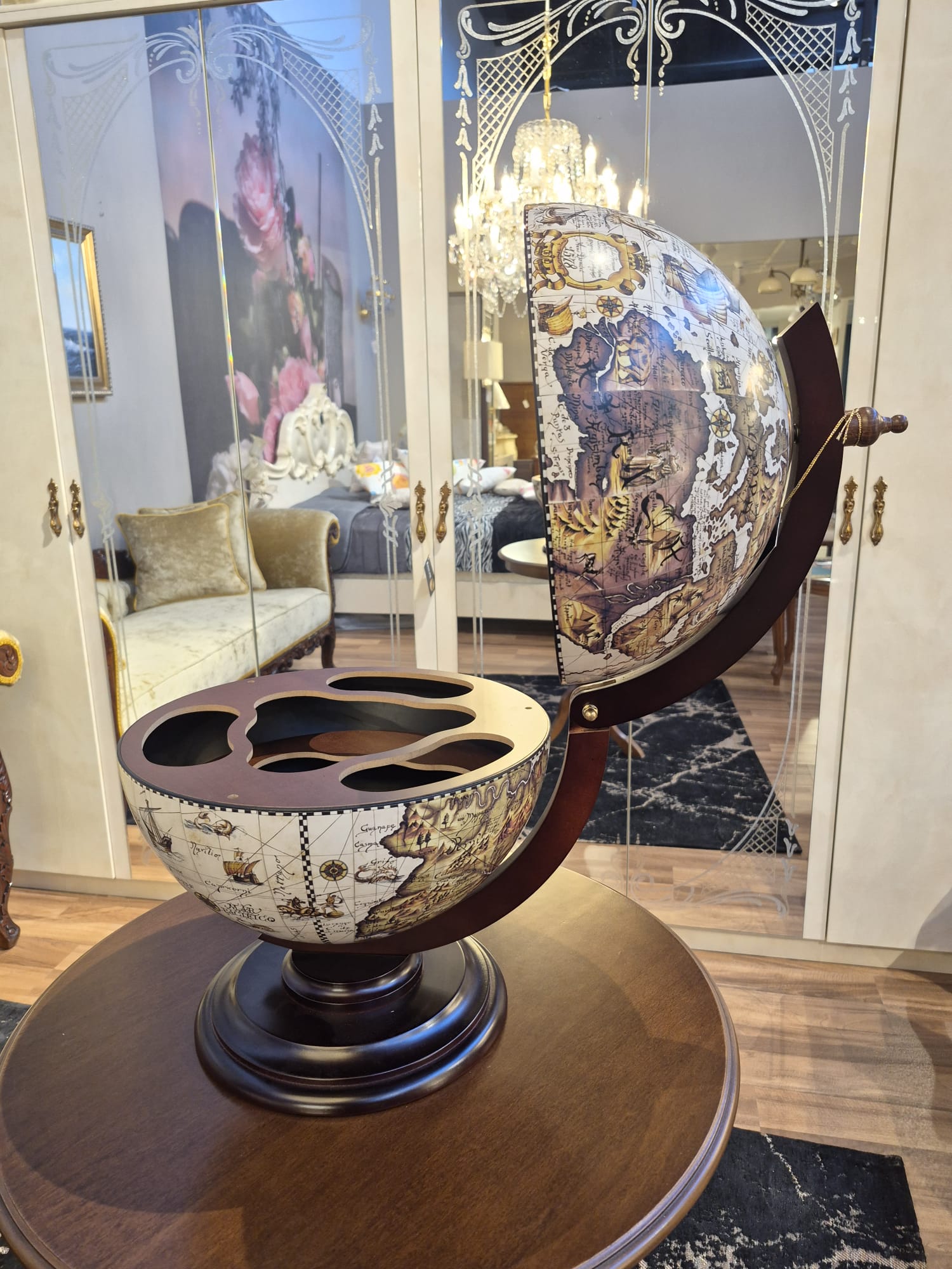 Z średnicą kuli 33 cm i całkowitą wysokością ok. 50 cm barek globus jest idealny do ustawienia na półce, komodzie lub stoliku kawowym. Wnętrze globusa skrywa praktyczny schowek na 1–2 butelki i kilka kieliszków, co czyni go zarówno dekoracyjnym, jak i użytecznym elementem przestrzeni domowej.