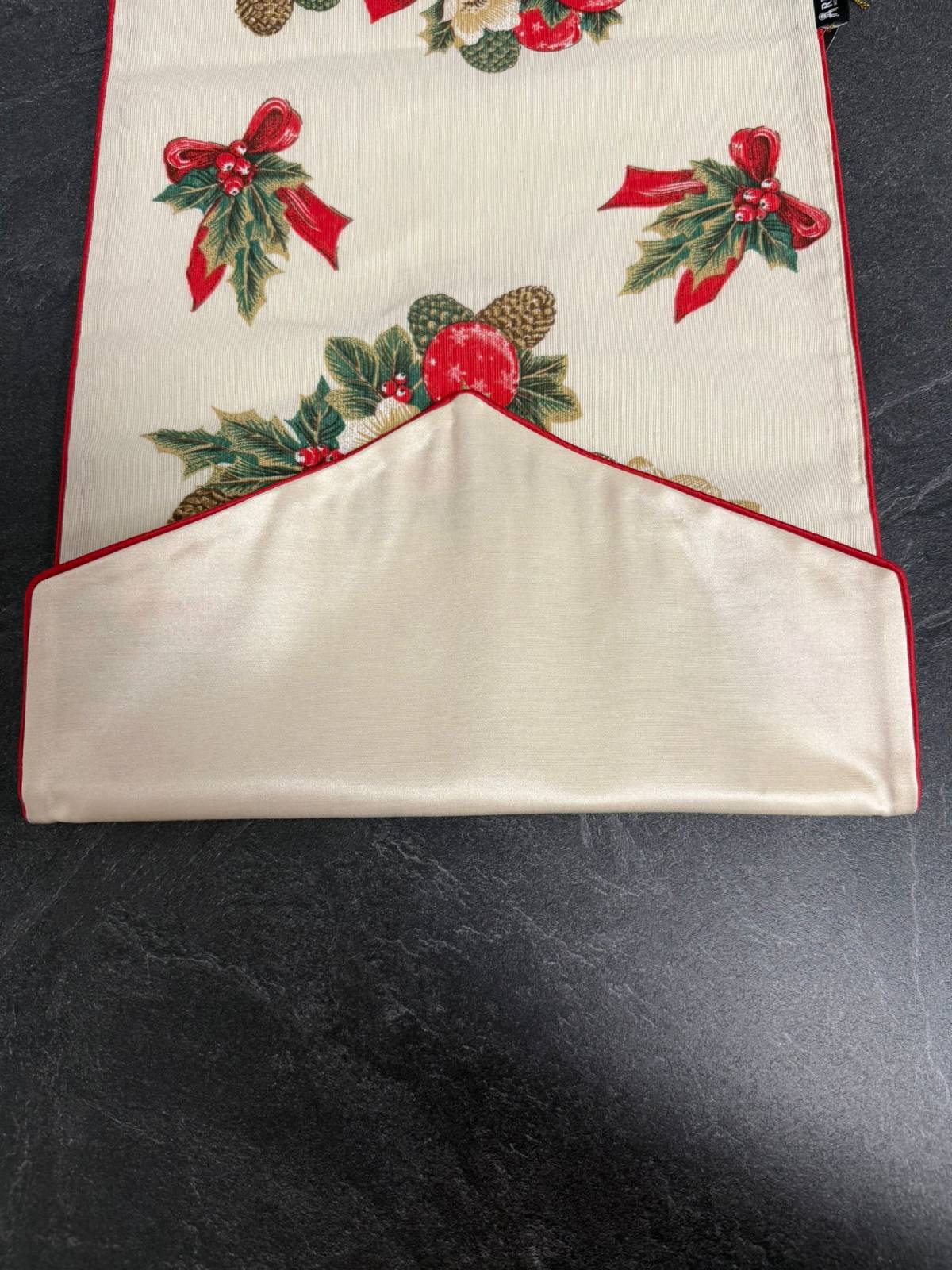 Wprowadź zimowy nastrój do swojego domu dzięki wyjątkowemu bieżnikowi świątecznemu! Ten elegancki dodatek w klasycznej kolorystyce bieli z zielono czerwonymi dodatkami został ozdobiony uroczymi motywami świątecznymi takimi jak stroiki świąteczne.
