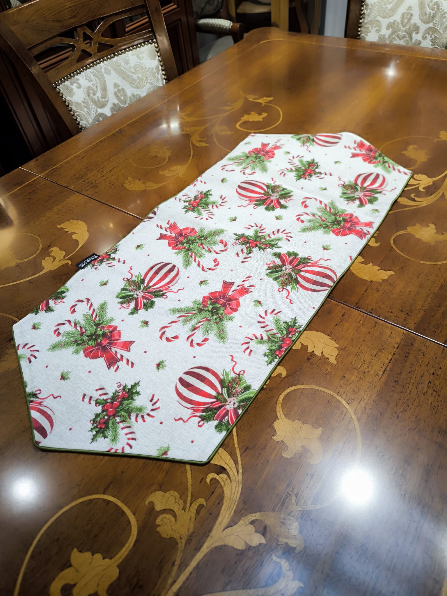 Wprowadź świąteczny nastrój do swojego domu dzięki wyjątkowemu bieżnikowi bożonarodzeniowemu! Ten elegancki dodatek w klasycznej kolorystyce bieli, zieleni i czerwieni został ozdobiony uroczymi motywami świątecznymi, takimi jak gałązki jodły, renifery i uśmiechnięte skrzaty.