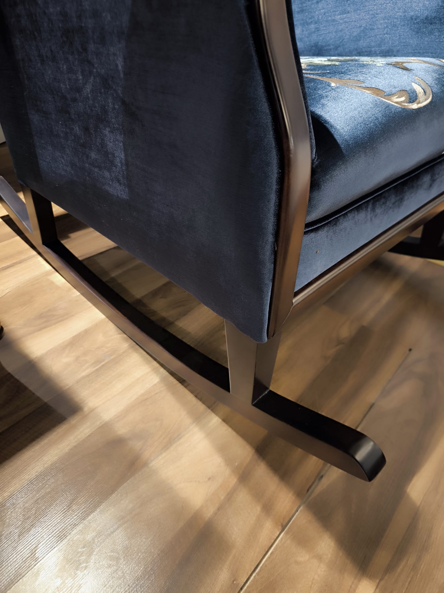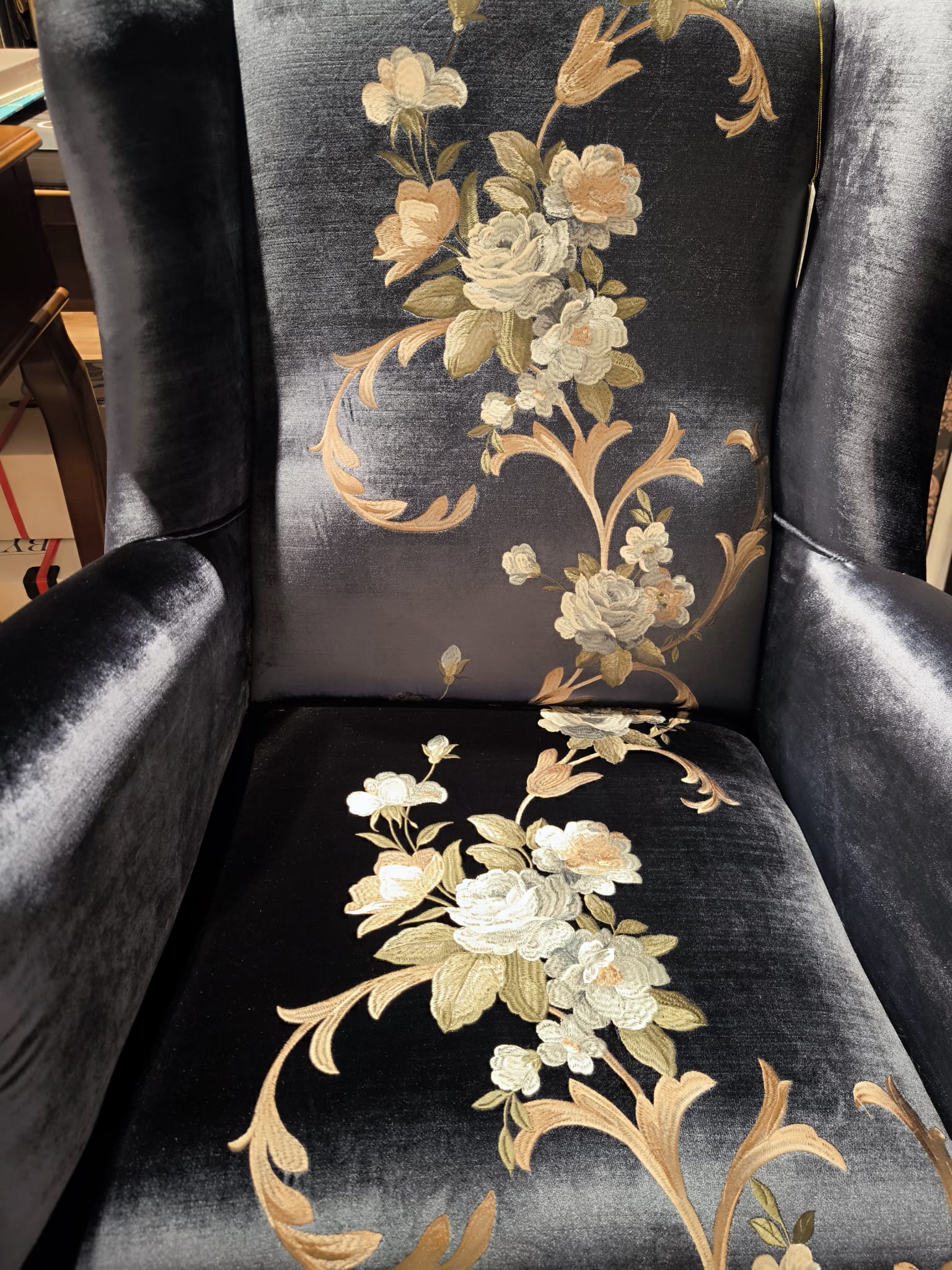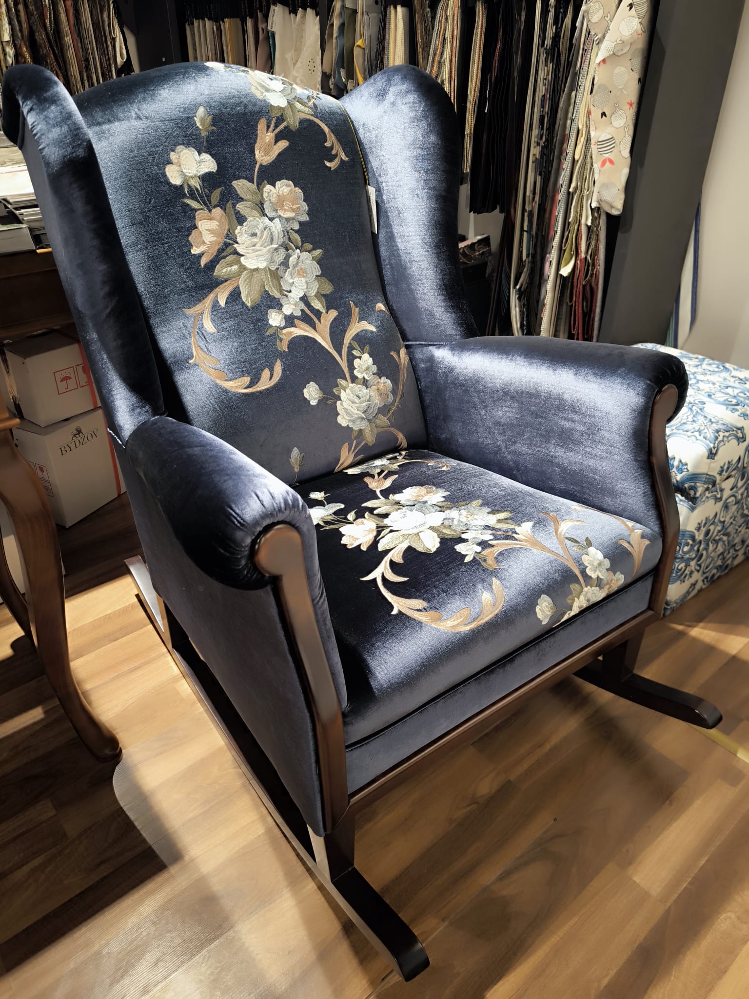 Wspaniała Tkanina: Fotel został obity tkaniną w odcieniu granatu o miękkiej strukturze i dużym połysku. Dodatkowo posiada ona haft z motywem błękitnych róż. Ta wyjątkowa tkanina dodaje fotelowi niepowtarzalnego uroku i ciepła, nadając mu wyjątkowy charakter.