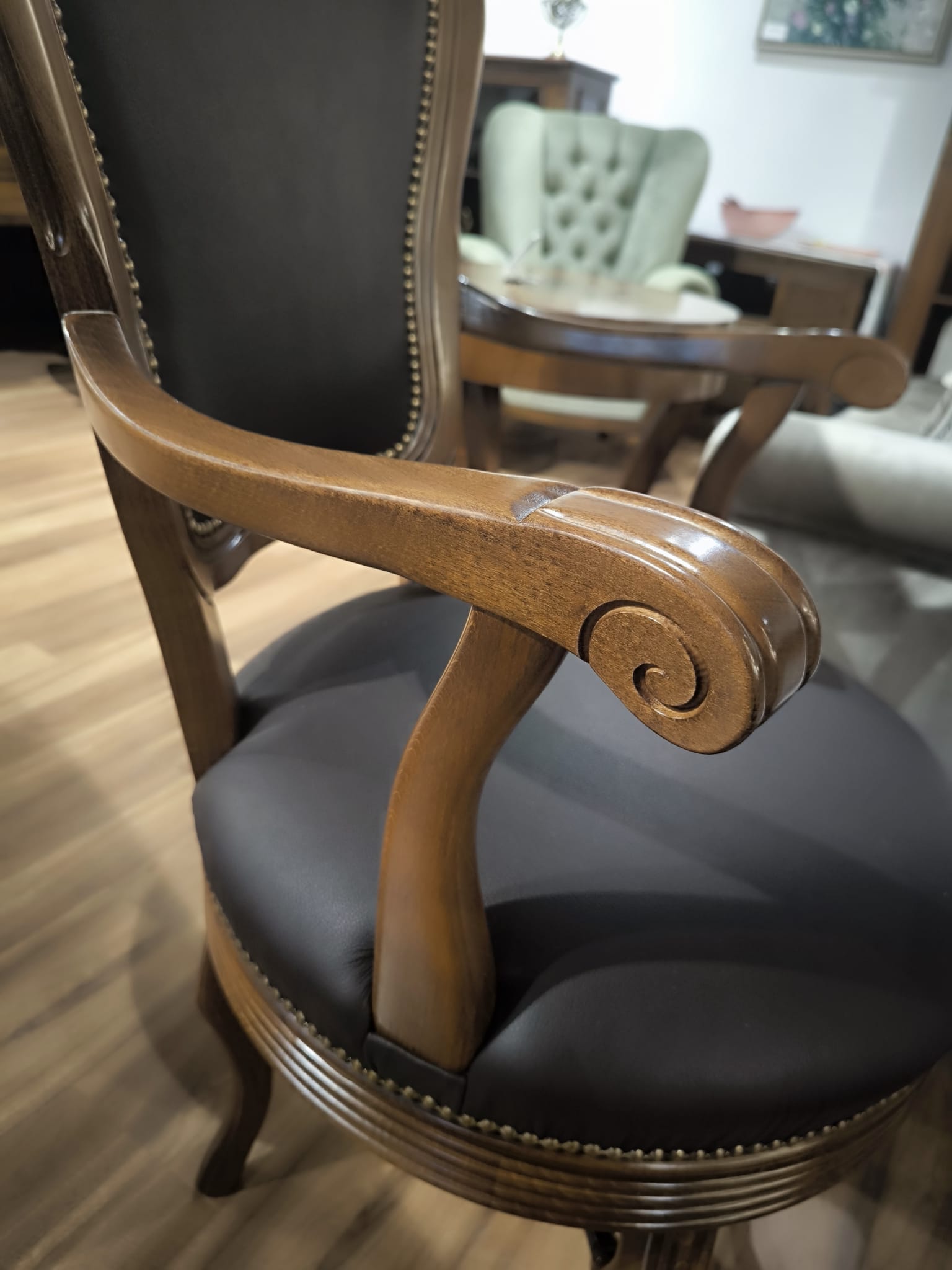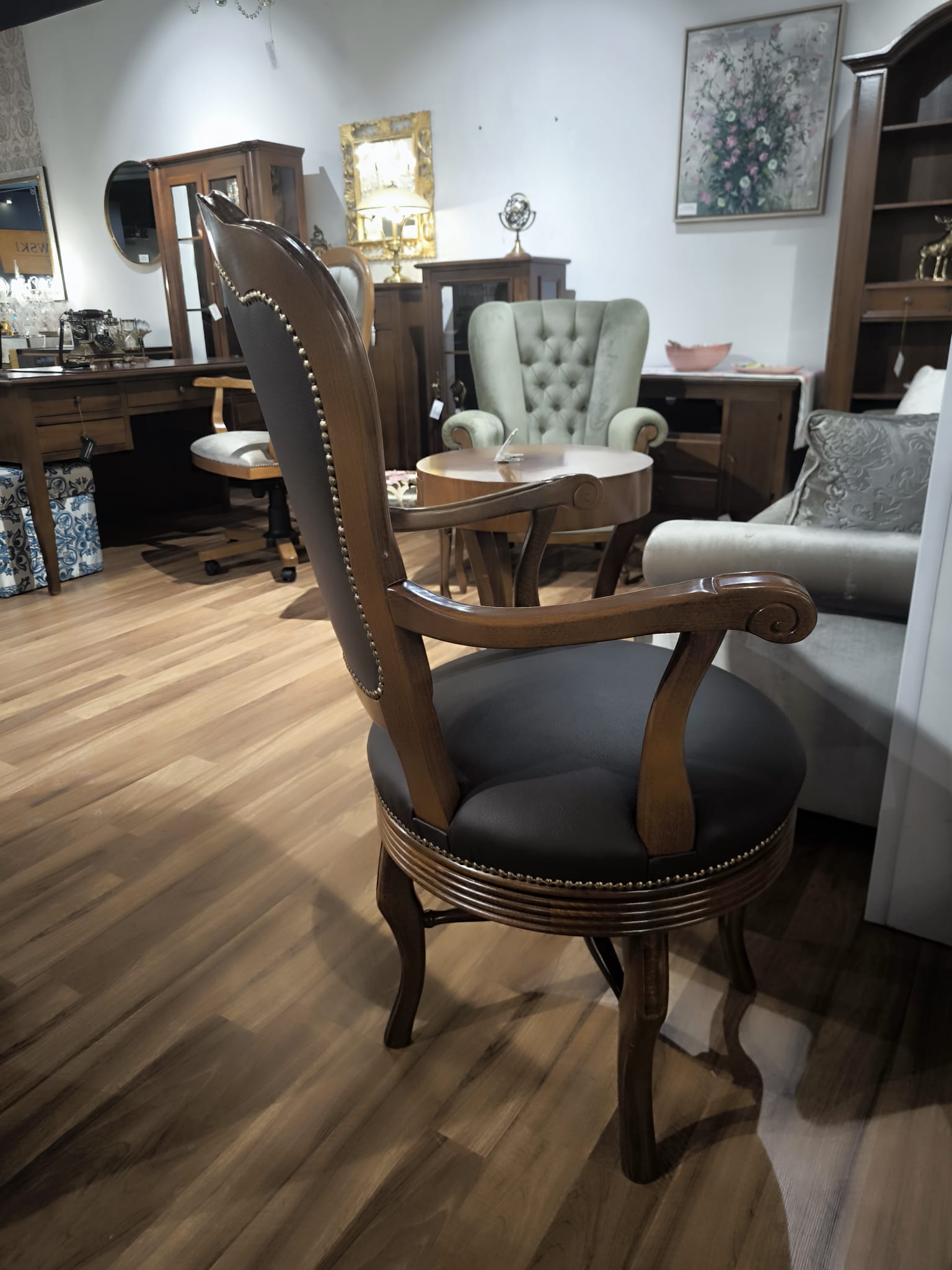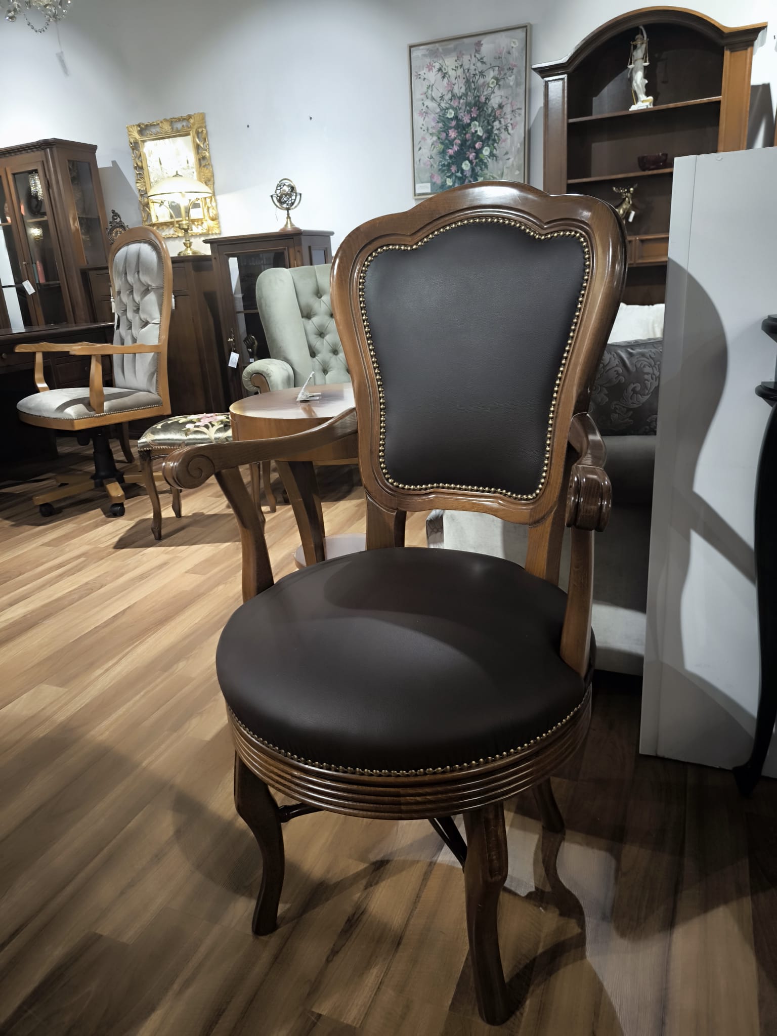 Poszukujesz eleganckiego fotela, który będzie zarówno wygodny, jak i stylowy? Oto Fotel Obrotowy 73/K – unikatowy mebel wykonany z drewna bukowego oraz tapicerowany skórzaną tkaniną w ciepłym odcieniu brązu.