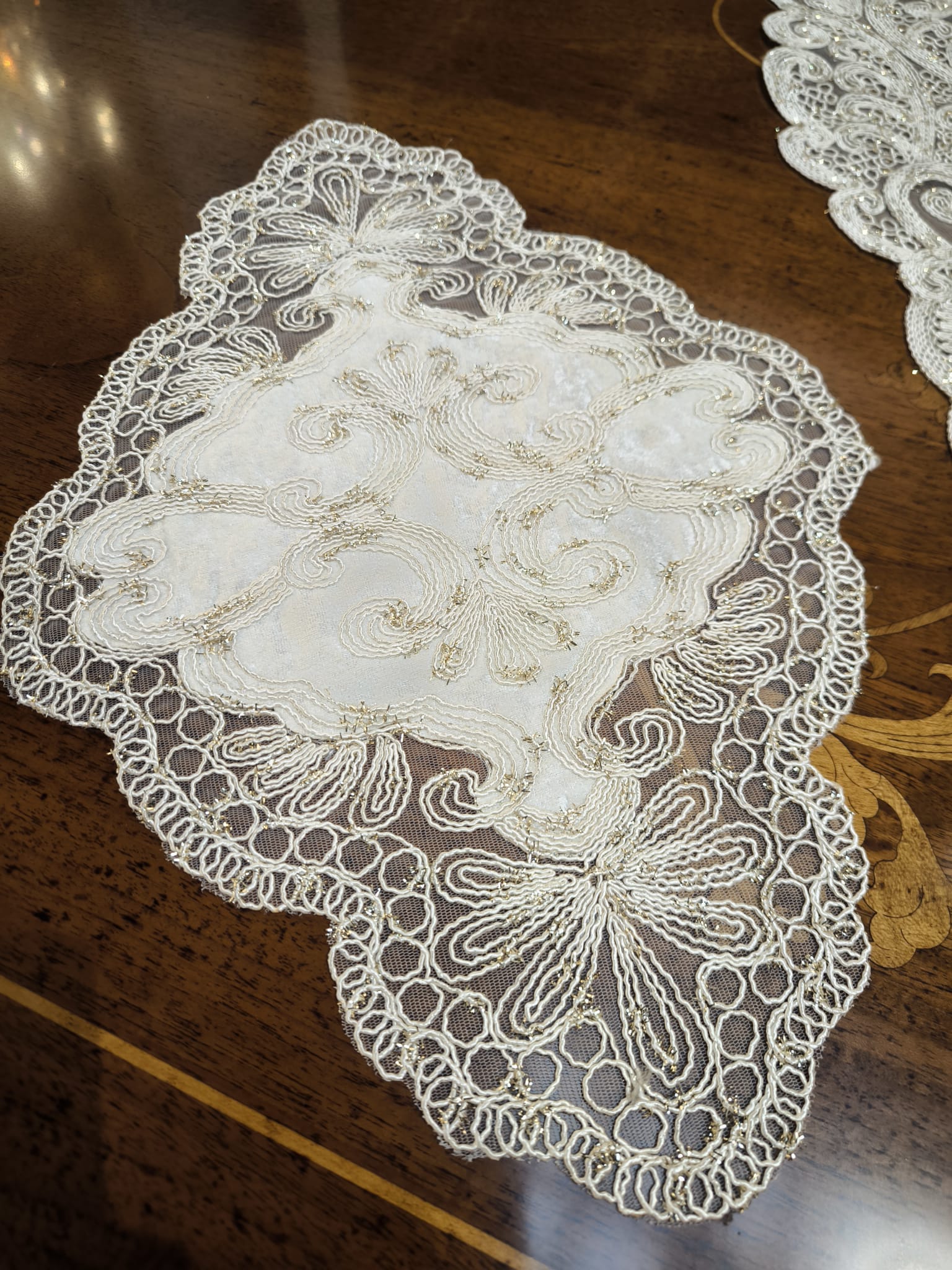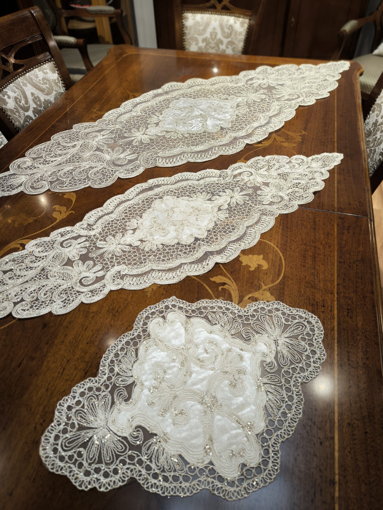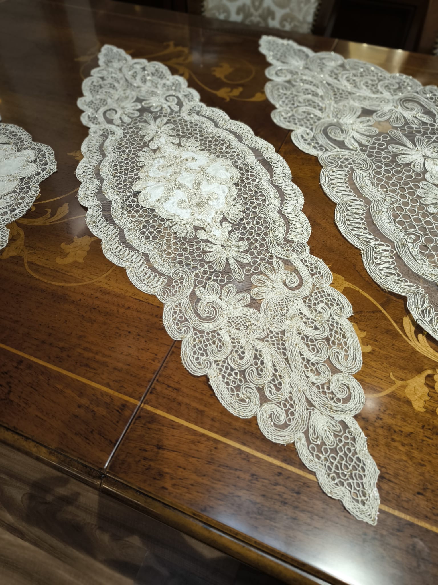 Zestaw składa się z pięciu elementów, wykonane są z delikatnej gipiury w kolorze ecru,