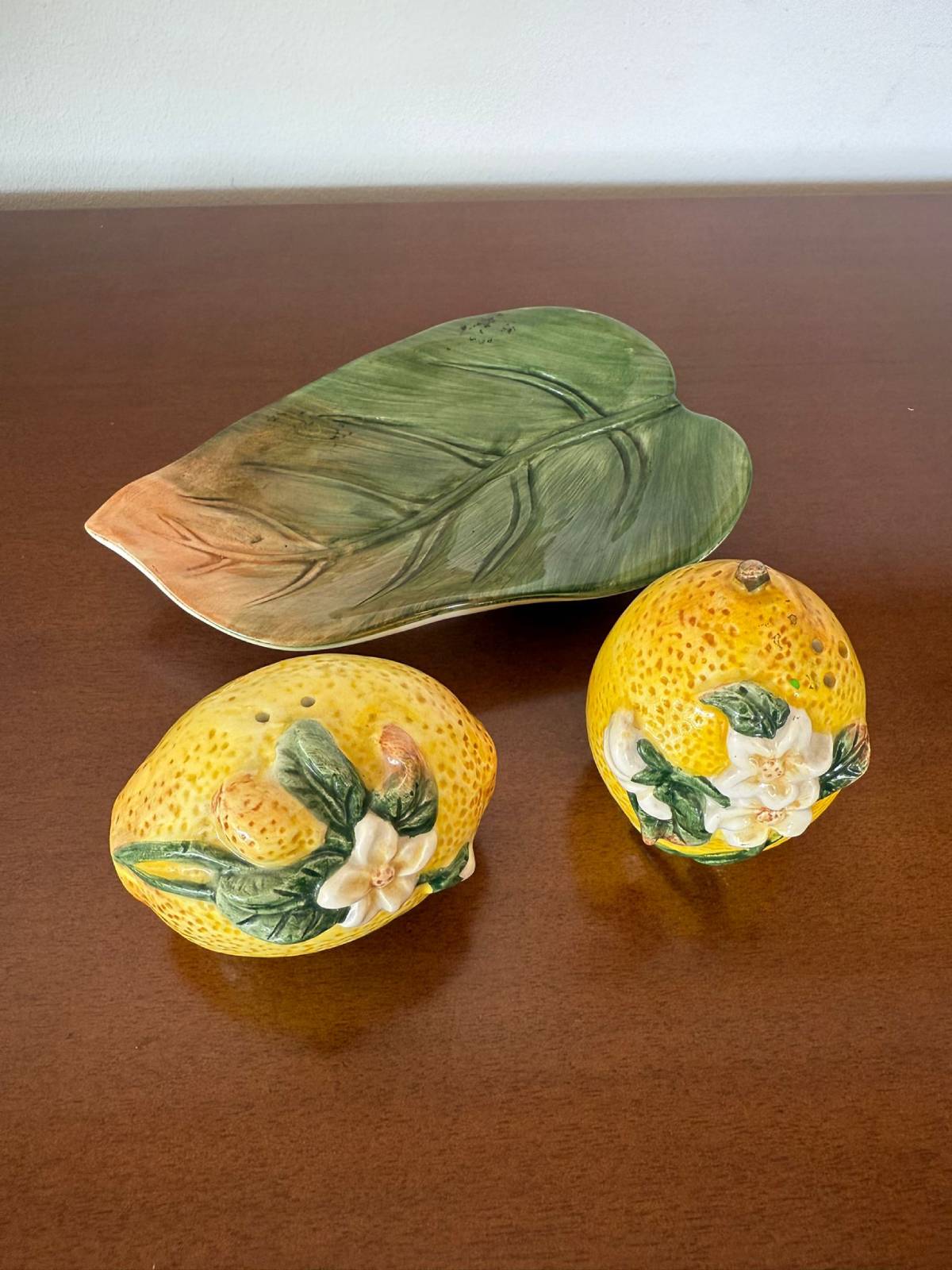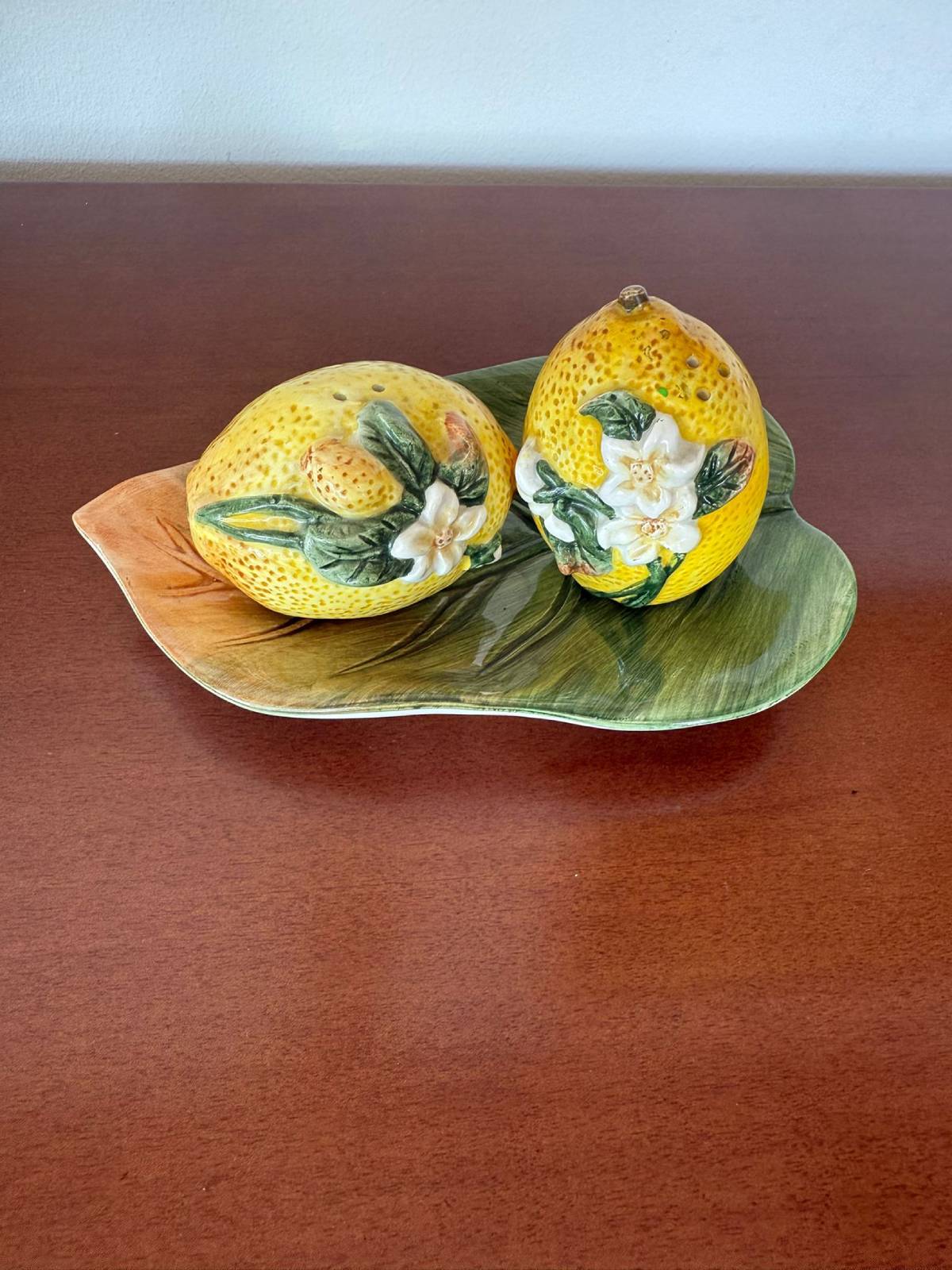 Zanurz się w subtelnym pięknie tradycyjnej ceramiki, gdzie każdy detal ma znaczenie, a wzór opowiada historię z wrażliwością i finezją. Piękny komplet do przypraw w kształcie cytryn ułożony na ceramicznym liściu.