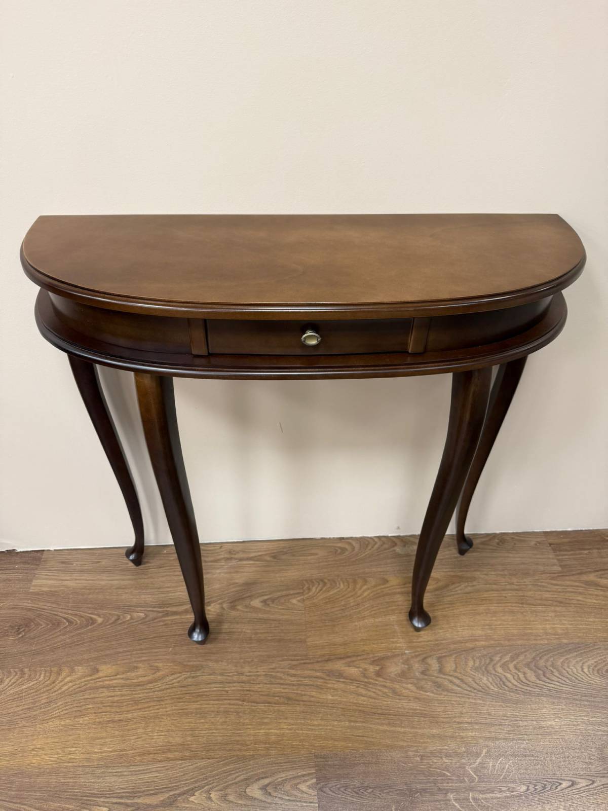Blat wykonany z płyty stolarskiej fornirowanej drewnem olchowym, nogi z litego drewna olchowego. Konsola 2KR posiada jedną szufladkę z ozdobnym uchwytem. Blat konsoli ma nierówny kształt, który dodaje jej uroku. Konsola stoi na trzech giętych nogach w stylu ludwikowskim.