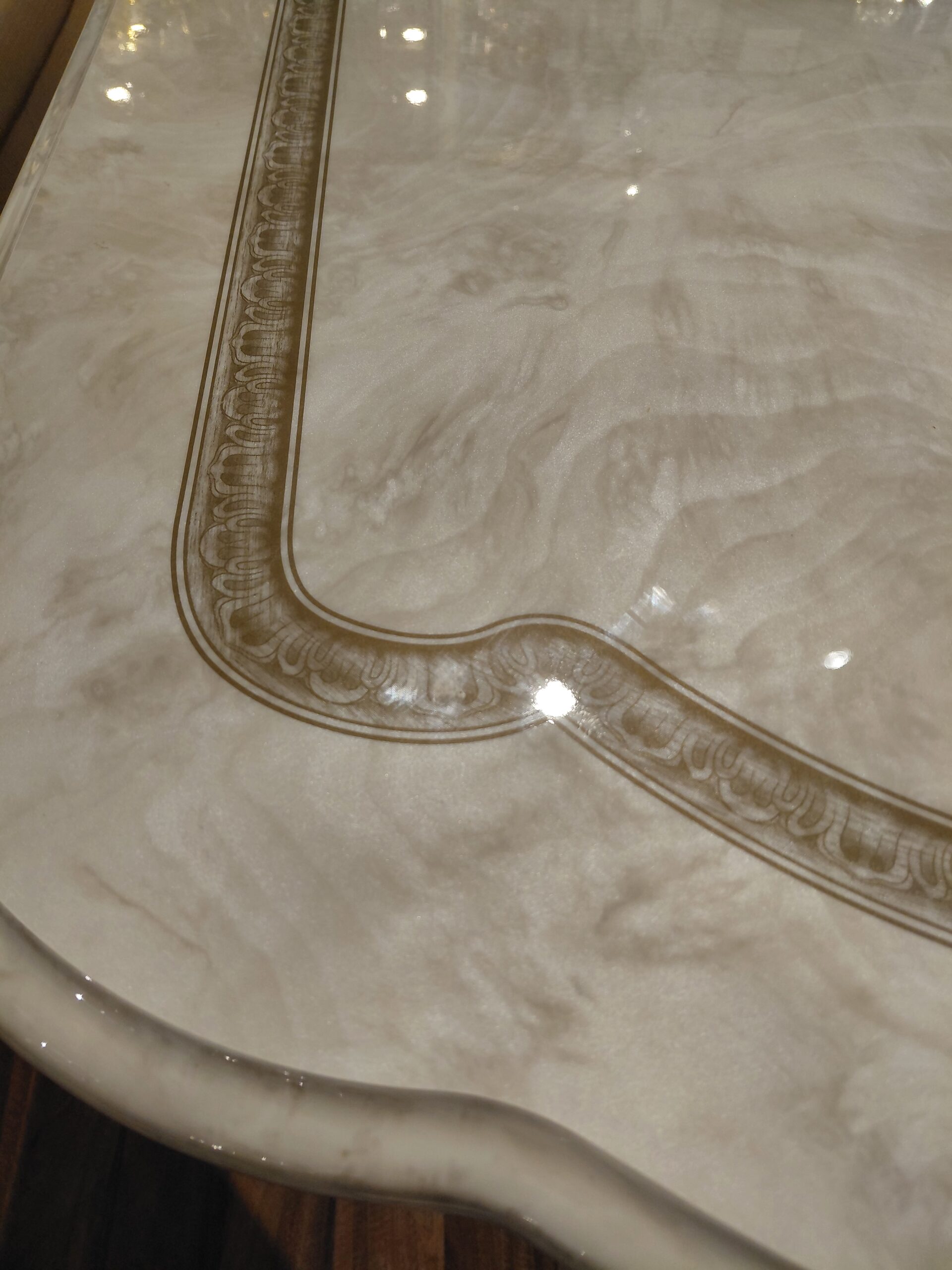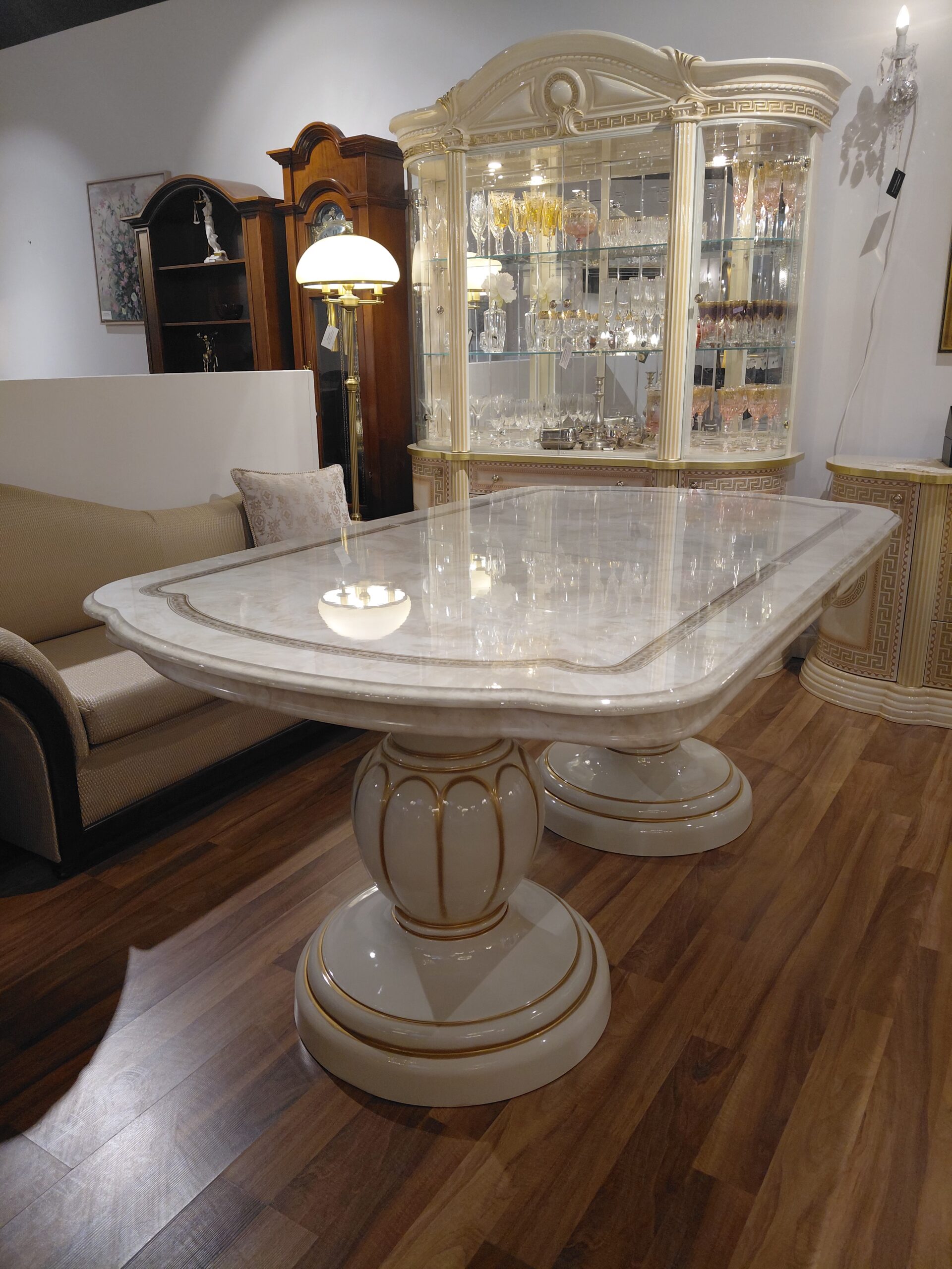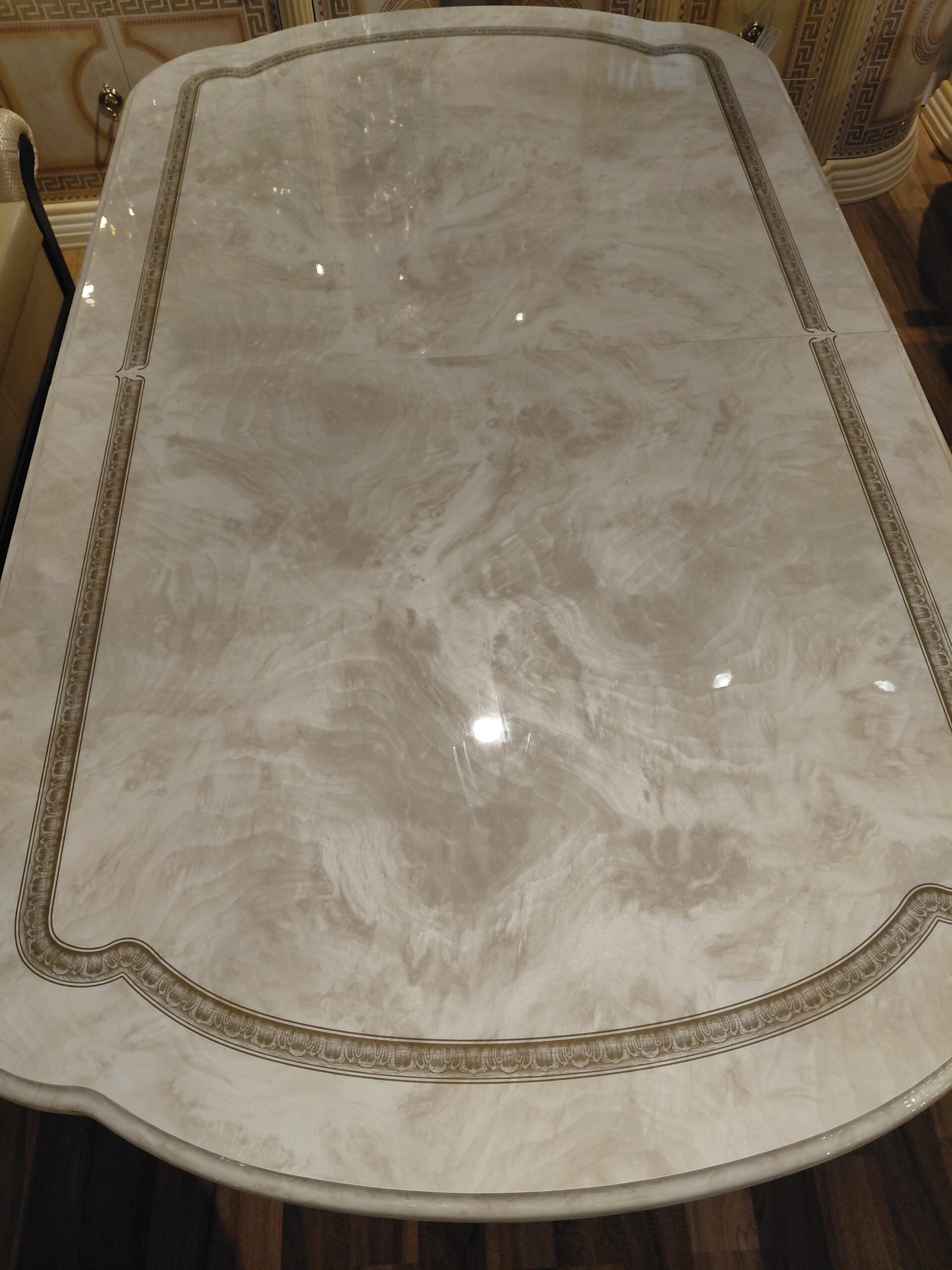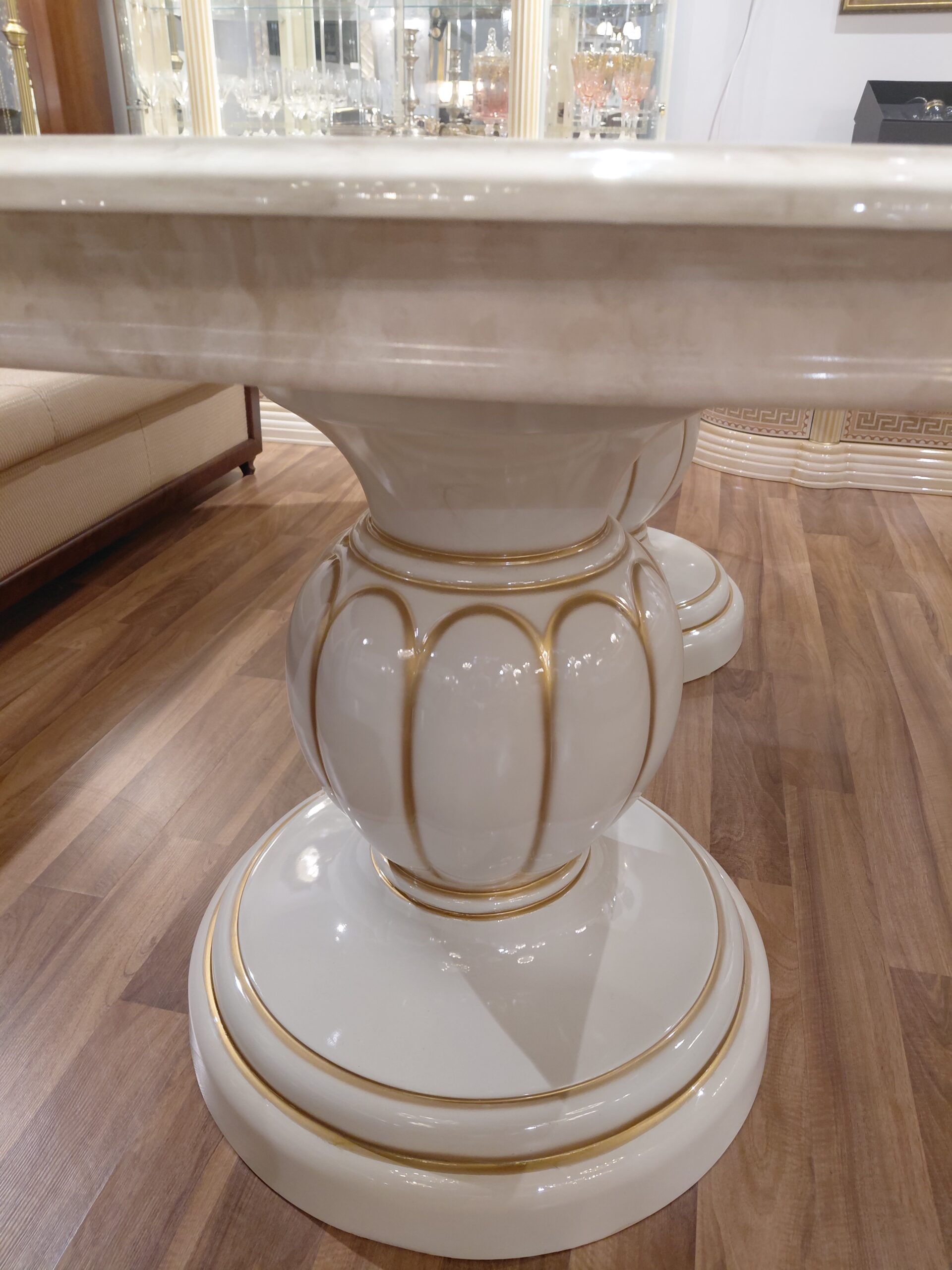 Stół Leonardo rozkładany to elegancki i luksusowy mebel, który zachwyca ponadczasowym designem. Blat wykonany w imitacji beżowego marmuru pięknie komponuje się z dekoracyjnymi detalami w odcieniu starego złota, nadając całości wyjątkowo szlachetny charakter. Solidna podstawa o rzeźbionej formie podkreśla prestiżowy styl stołu i zapewnia stabilność.