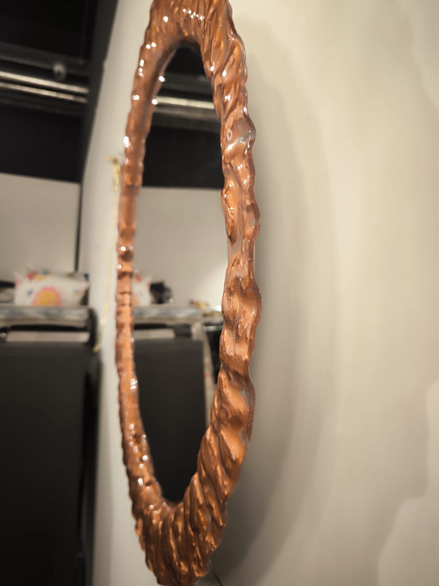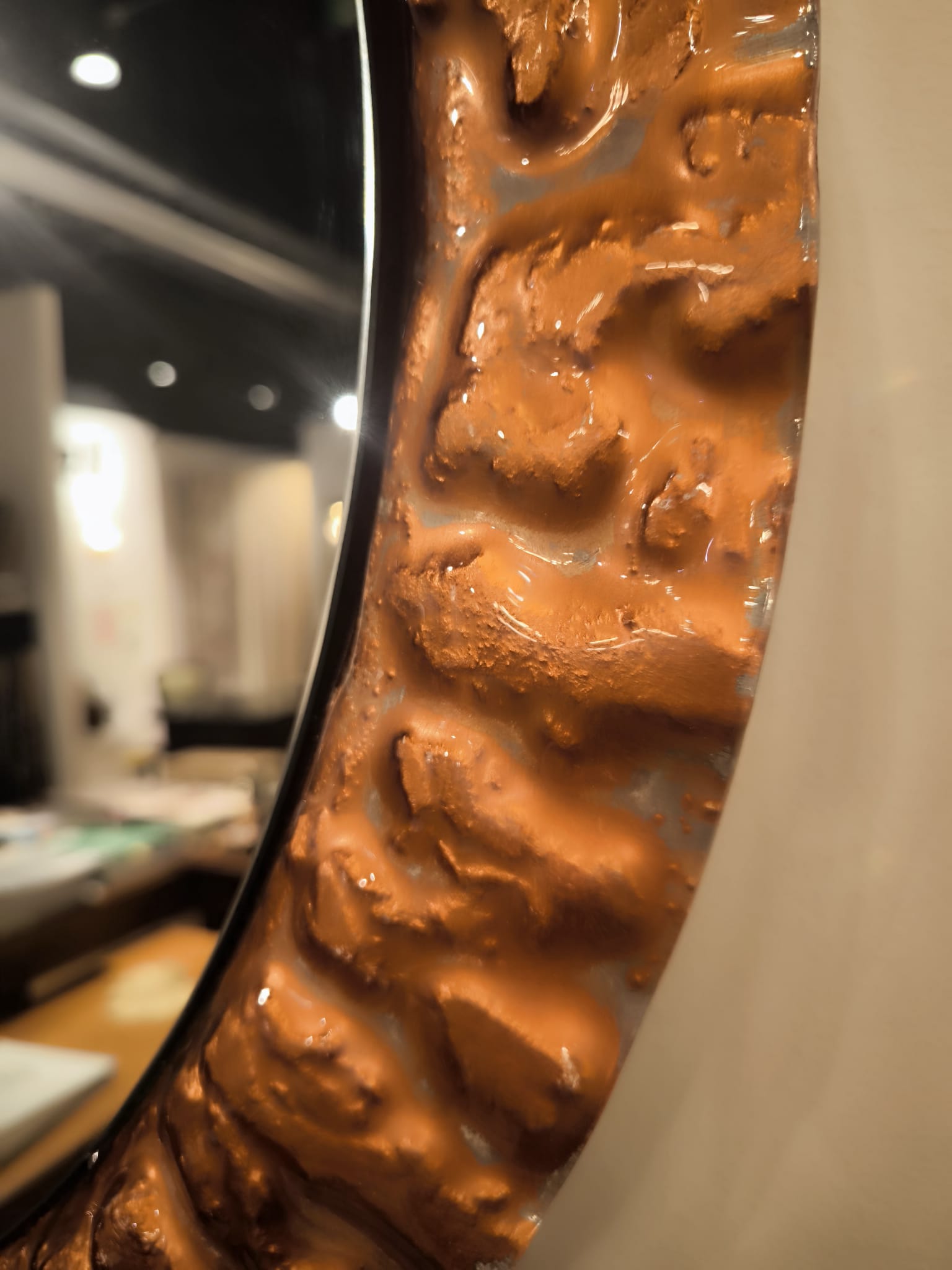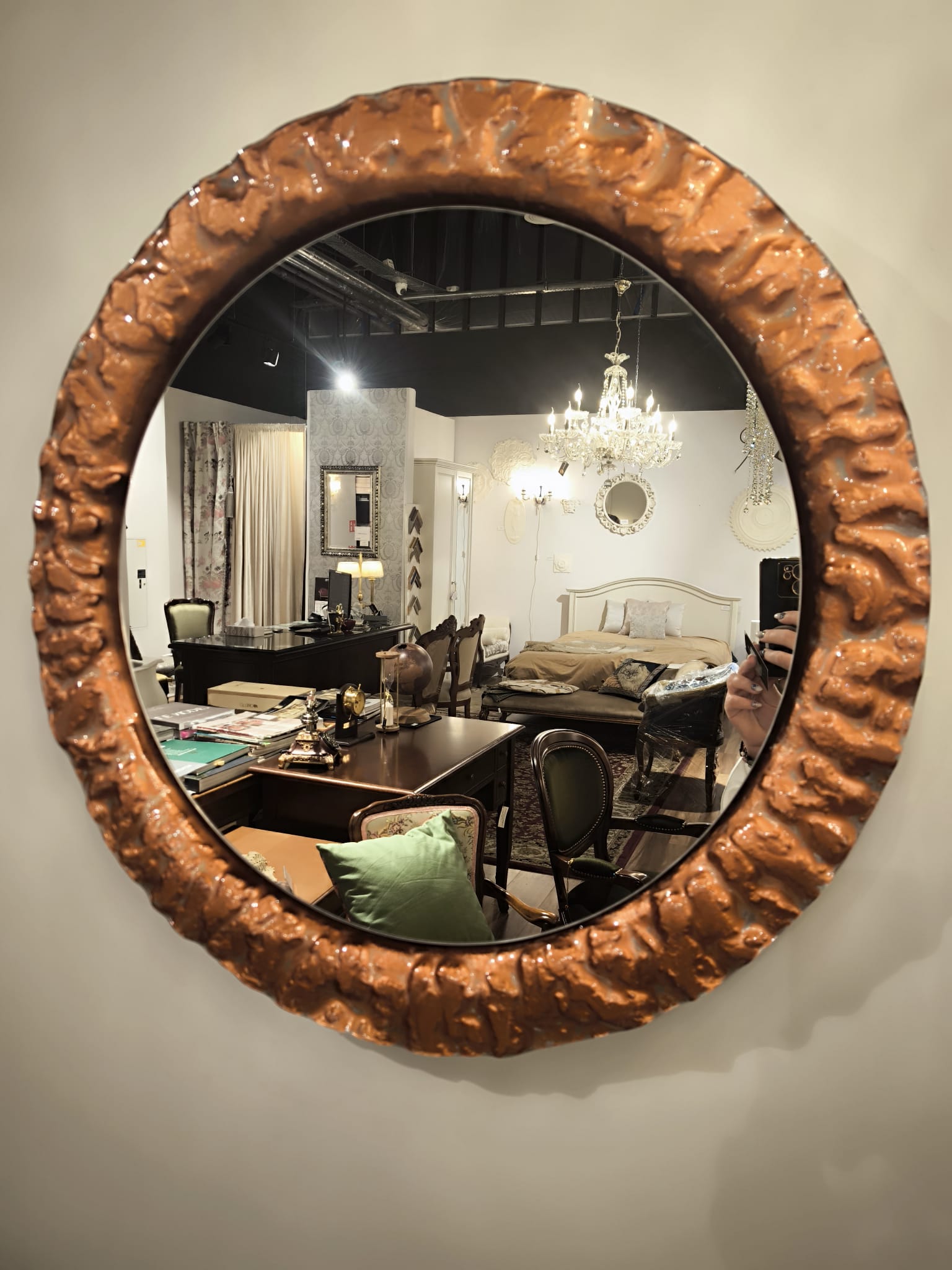 Okrągłe lustro o średnicy 67 cm to wyrazisty element dekoracyjny, który łączy rzemieślniczy charakter z elegancją. Całość wykonana jest ze szkła, a rama powstała z ręcznie formowanego szkła, malowanego od spodu na szlachetny odcień miedzi. Nieregularna, rzeźbiarska faktura ramy nadaje lustrze unikatowy wygląd i subtelną grę światła.