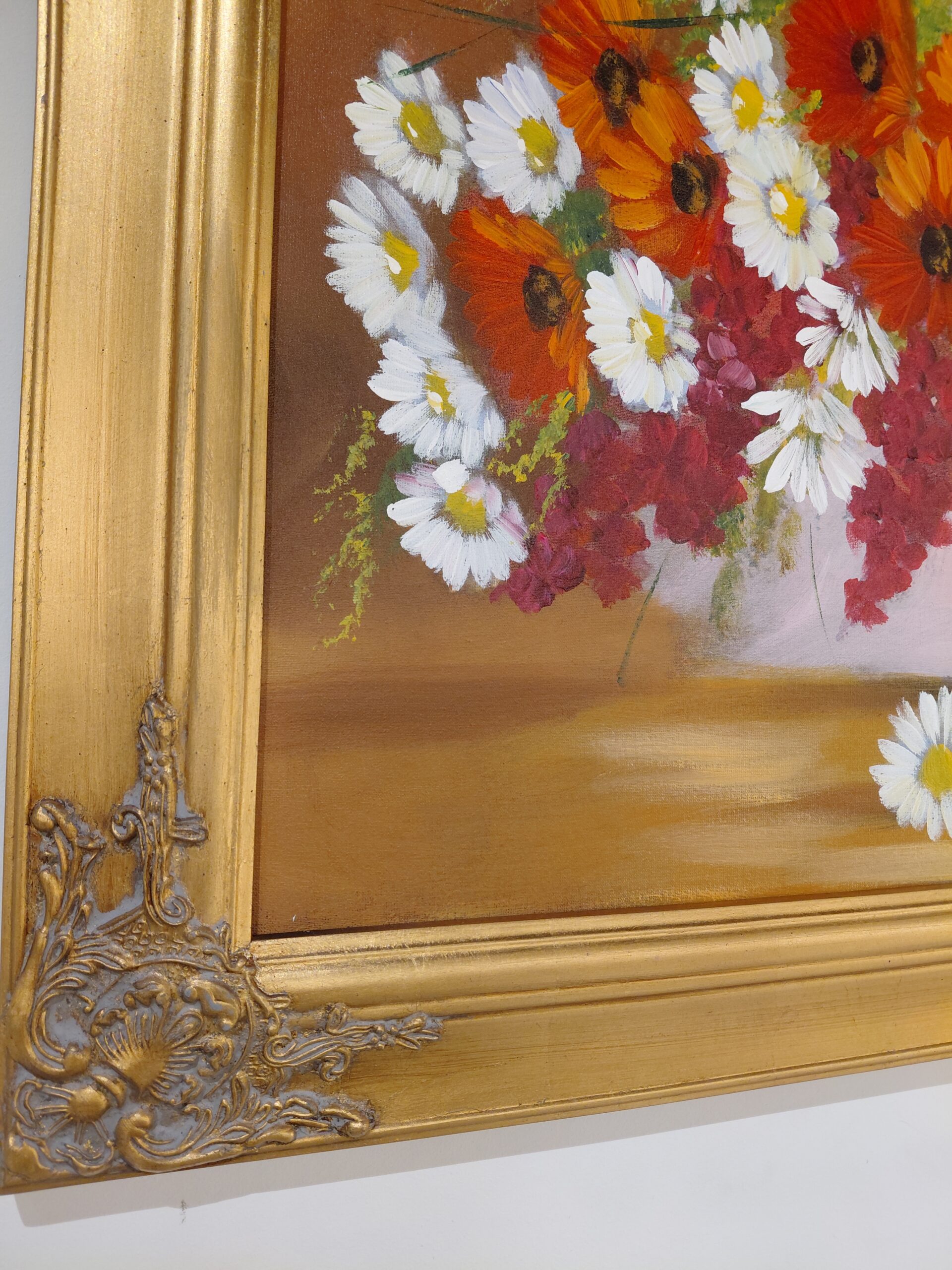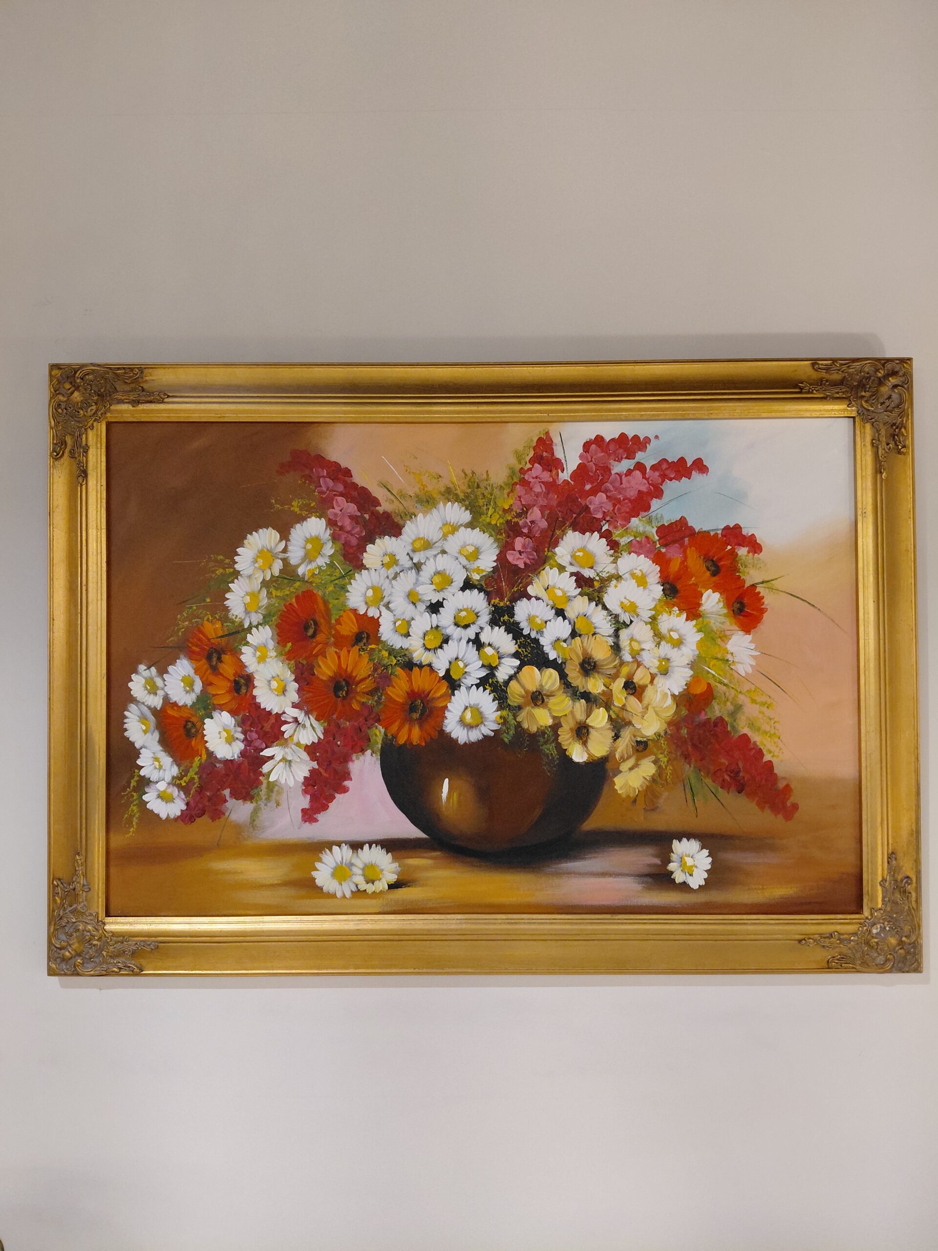 Obraz olejny ręcznie malowany na płótnie o wymiarach całkowitych z ramą 105 × 73 cm, przedstawiający efektowną kompozycję kwiatową w eleganckim stylu martwej natury. Centralnym elementem dzieła jest bogaty bukiet barwnych kwiatów – dominują białe margerytki, czerwone i pomarańczowe gerbery oraz subtelne żółte akcenty, ułożone w ciemnym, klasycznym wazonie. Całość spoczywa na stonowanym tle, które podkreśla intensywność kolorów i nadaje kompozycji głębi.