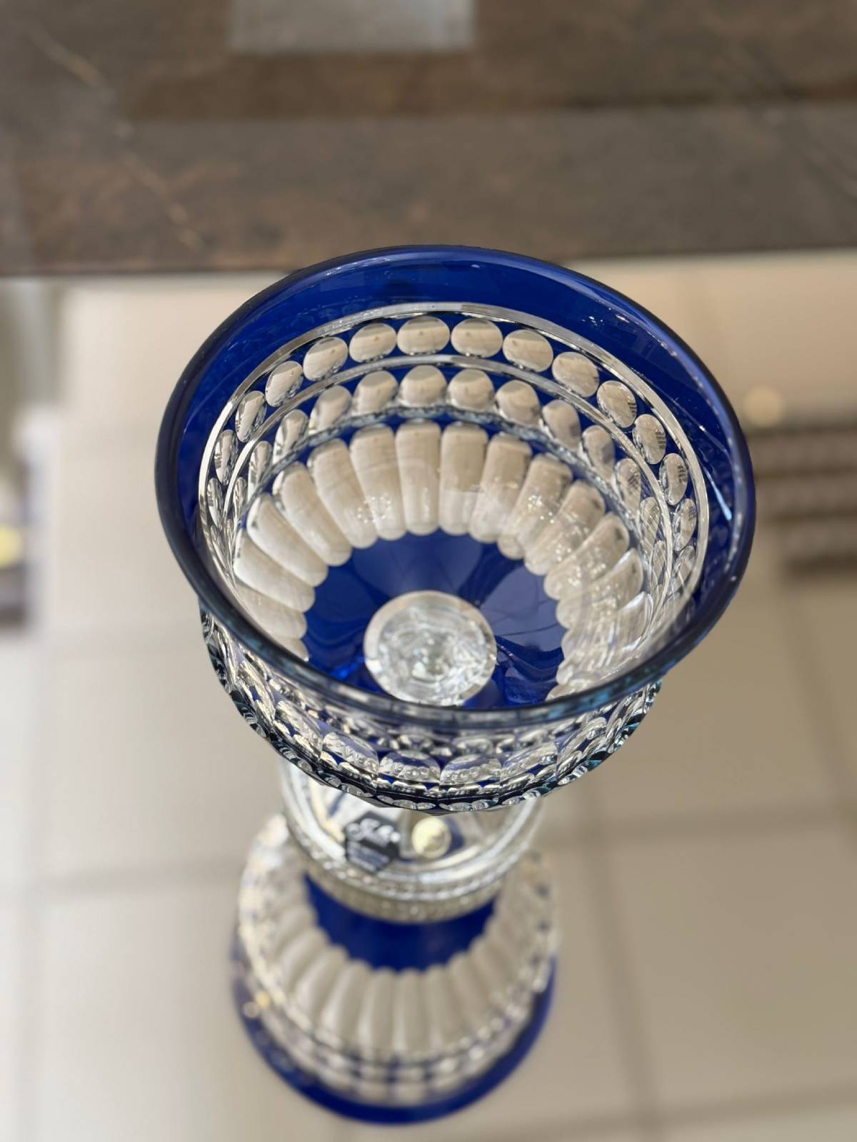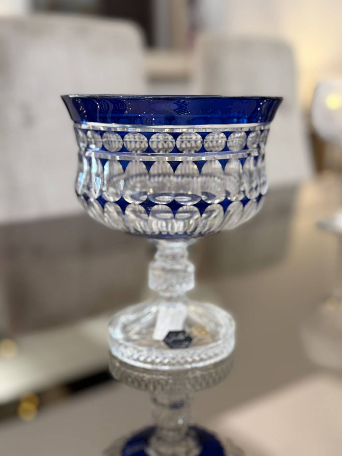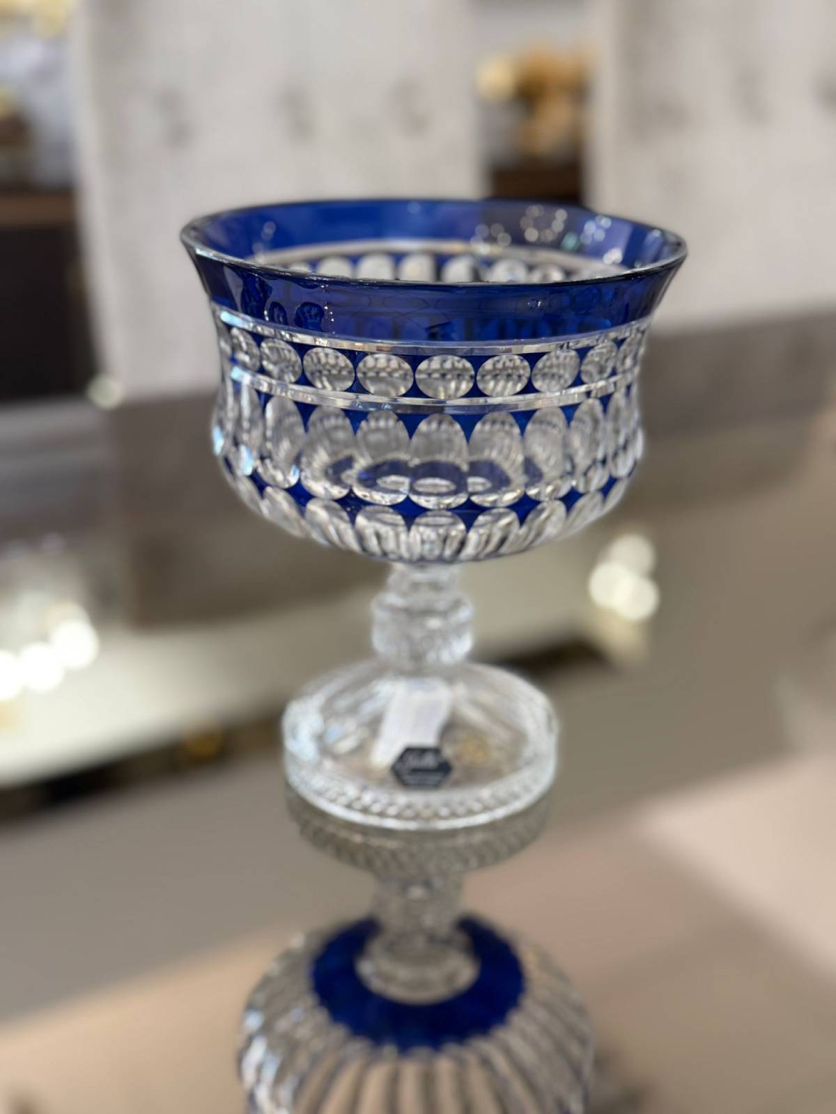 Kolorowa owocarka na nodze, wykonana z wysokiej jakości szkła kryształowego w kolorze niebieskim.