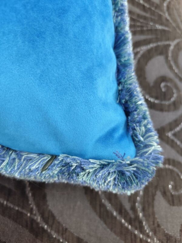 Poduszka w kolorze niebieskim wykończona trawką, wykonana z włoskiej tkaniny. Posiada suwak umożliwiający pranie poszewki. Wypełnienie mieszanką pianki i silikonu nadaje sprężystości i trwałości tej uniwersalnej dekoracji sofy lub fotela.