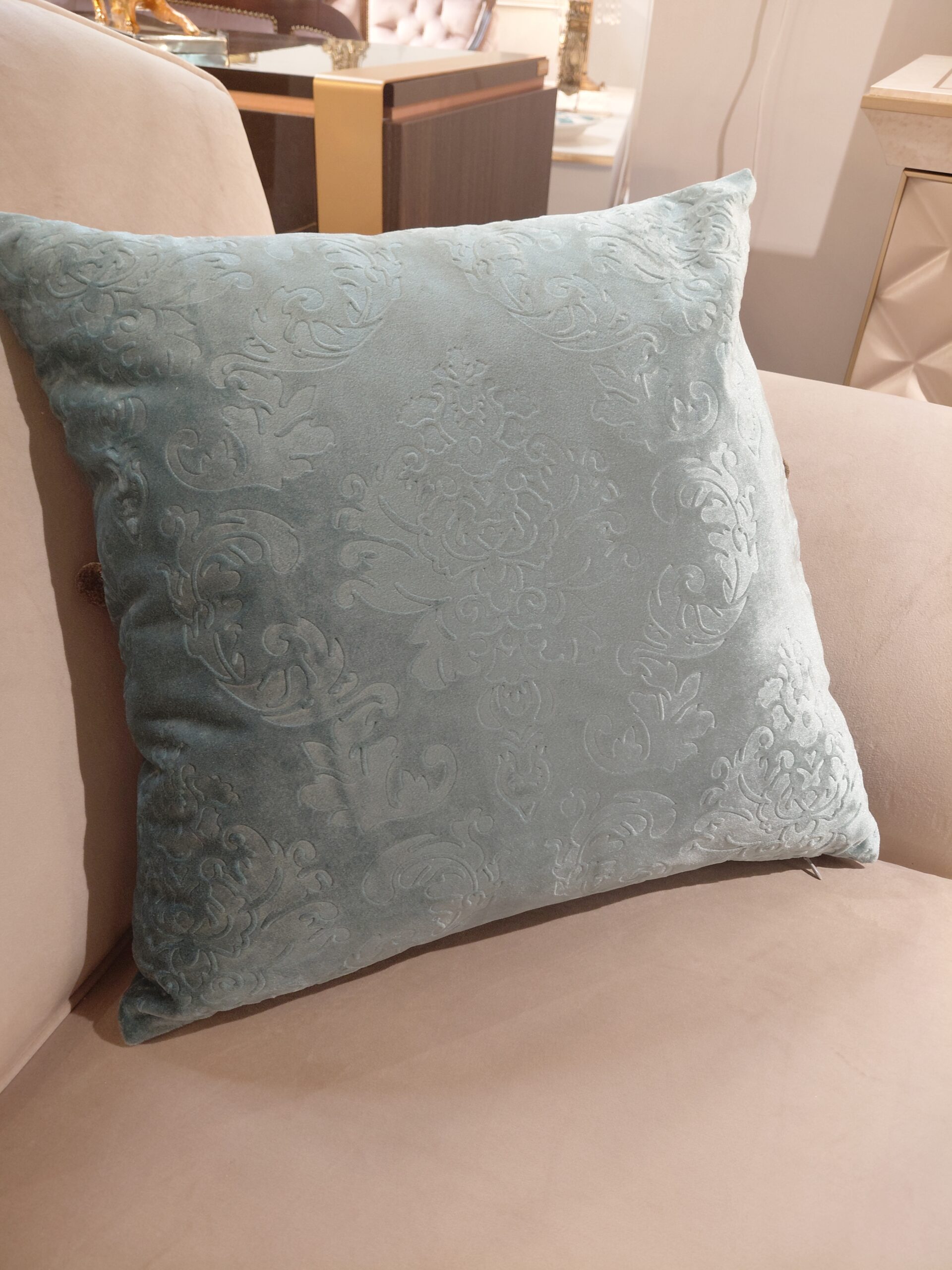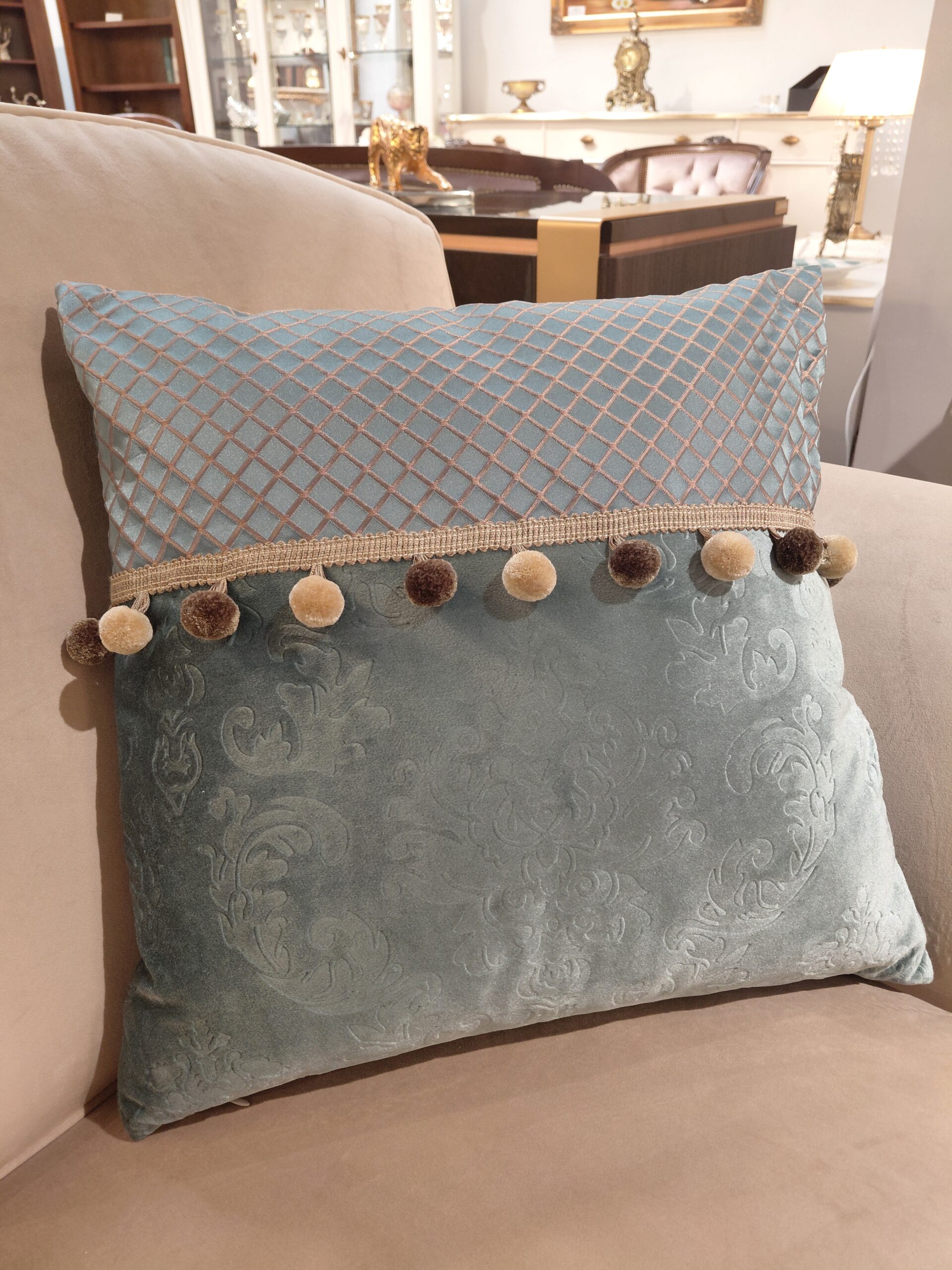 Niezwykle miękka poduszka wykonana z najwyższej jakości welurowej tkaniny w odcieniu delikatnego błękitu, wpadającego w zieleń. Dodano także element z gładkiej tkaniny w kratkę. Dodatkowego uroku dodaje taśma z pomponami wszyta w poduszkę.