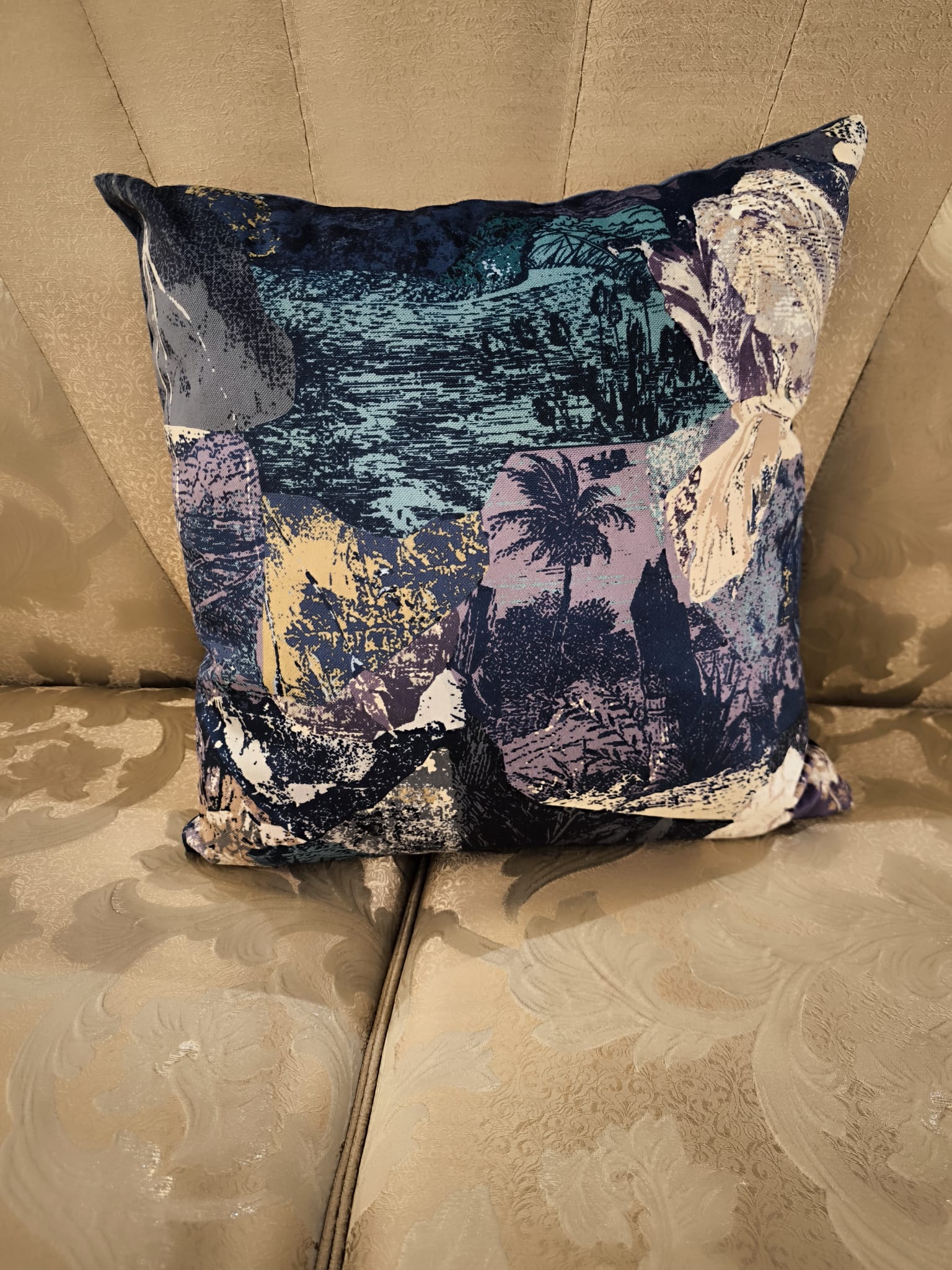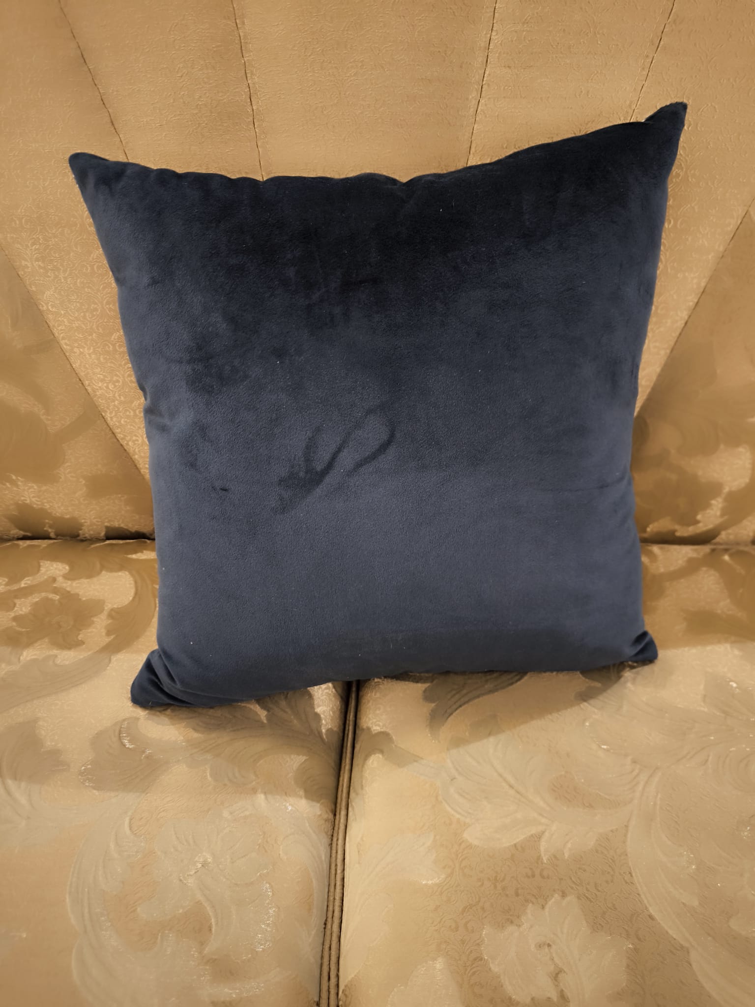 Elegancka poduszka uszyta z wysokiej jakości tkaniny welurowej o bogatym wzorze w odcieniach granatu i fioletu. Tkanina charakteryzuje się wyjątkową trwałością i gęstym splotem, dzięki czemu poduszka prezentuje się stylowo i jest odporna na codzienne użytkowanie.