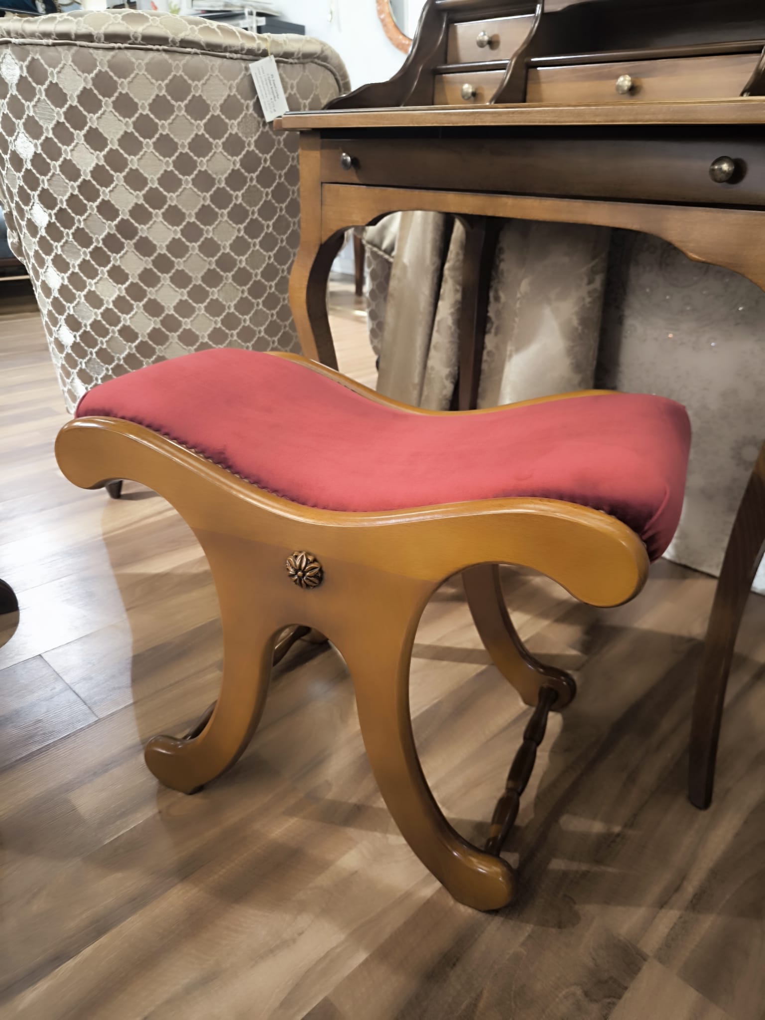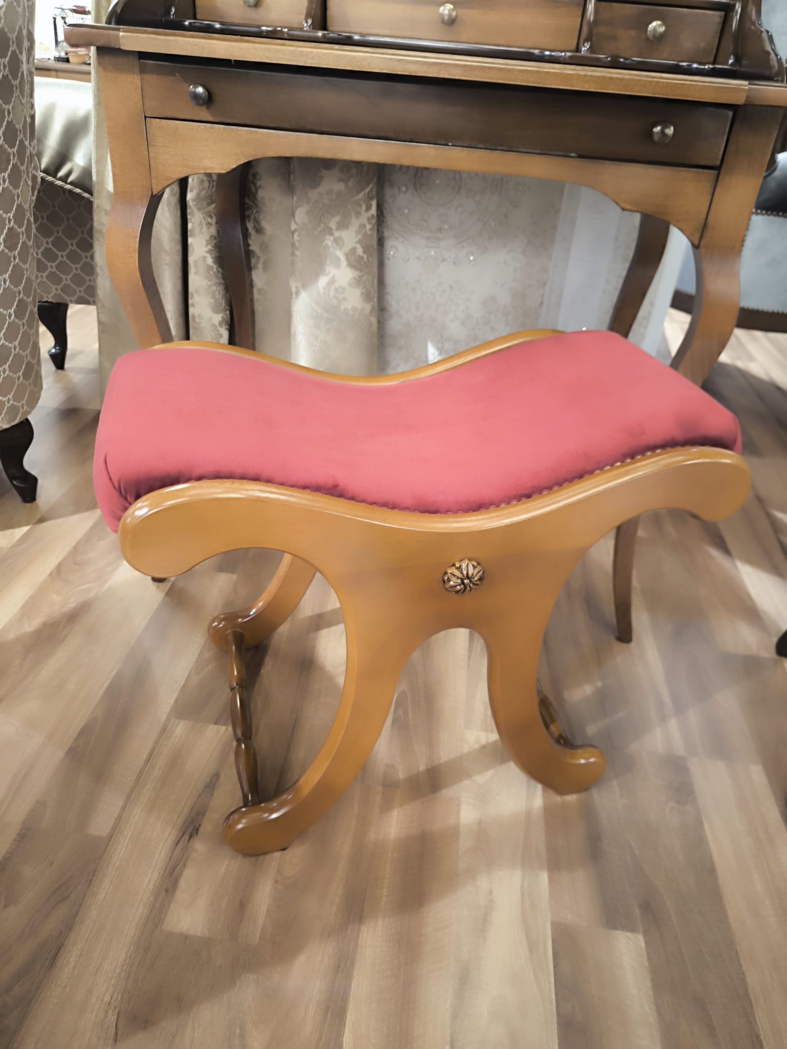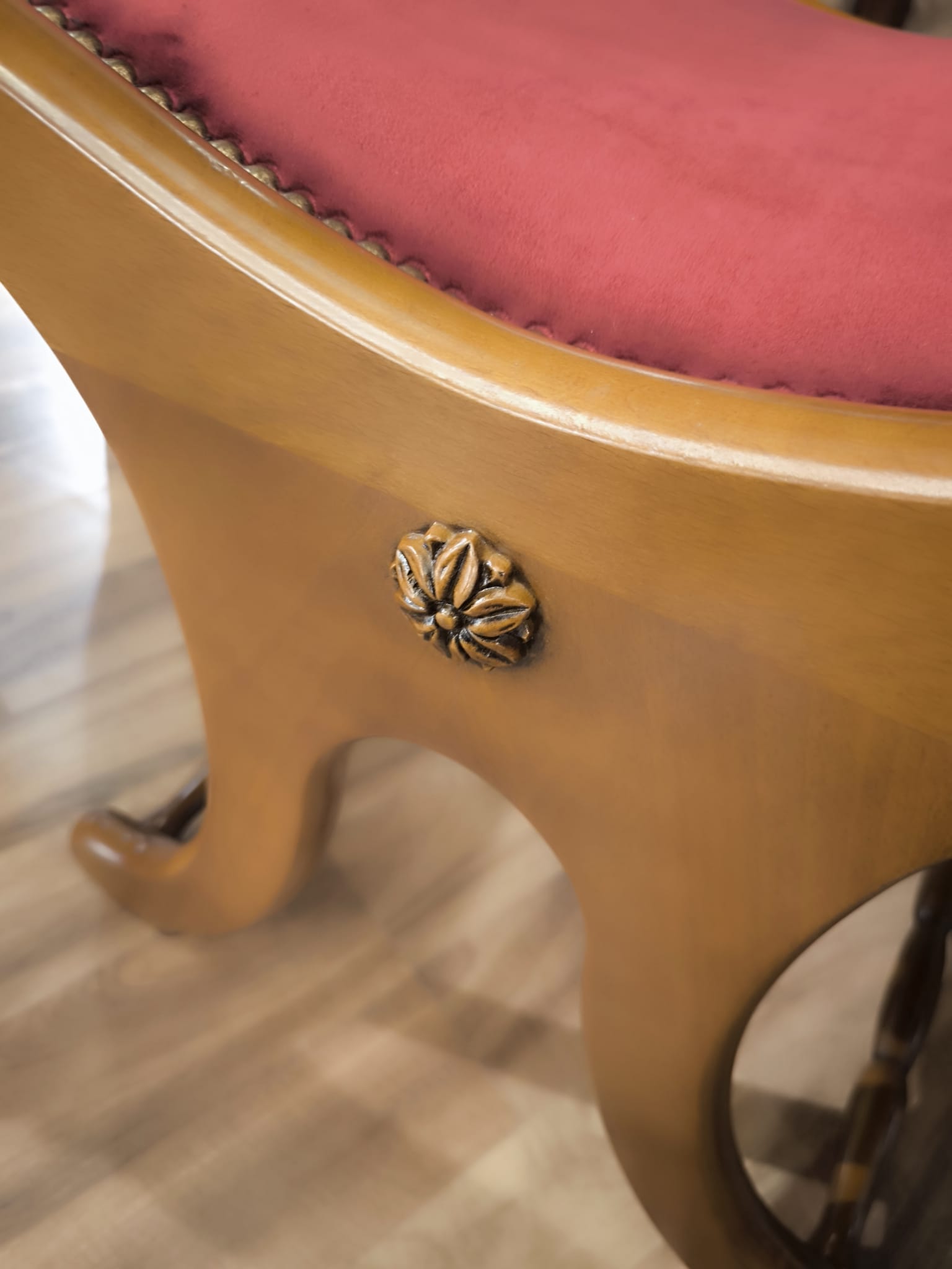 Siedzisko w odcieniu wina, drewno to kolor jasnego orzecha.