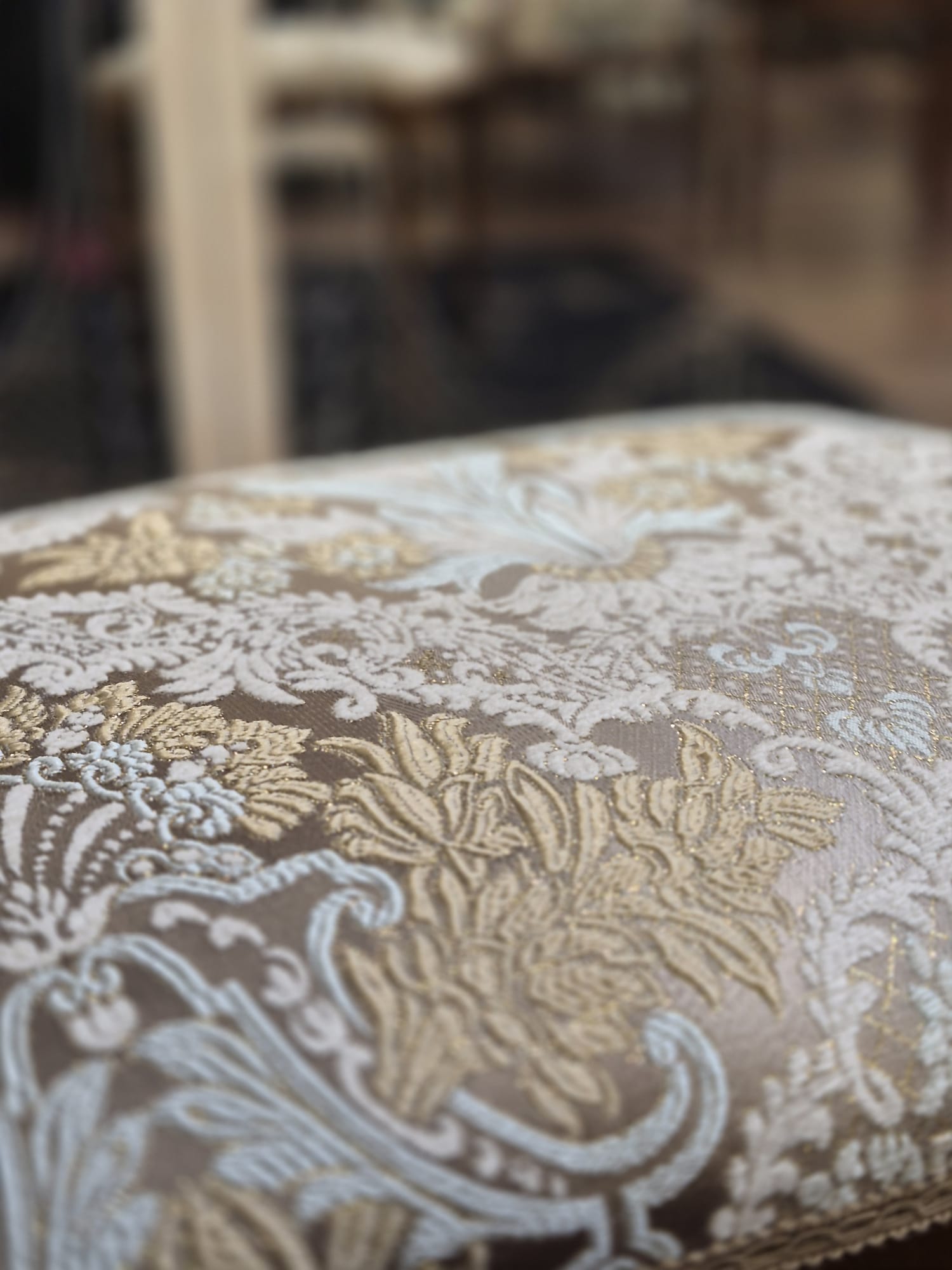 Beżowe odcienie pufy z delikatnym złotym akcentem doskonale harmonizują z różnymi stylami aranżacji — od klasycznych i vintage po bardziej nowoczesne wnętrza. Puf może pełnić funkcję dodatkowego siedziska dla gości lub dekoracyjnego elementu aranżacji, który wzbogaca przestrzeń i podkreśla jej charakter.