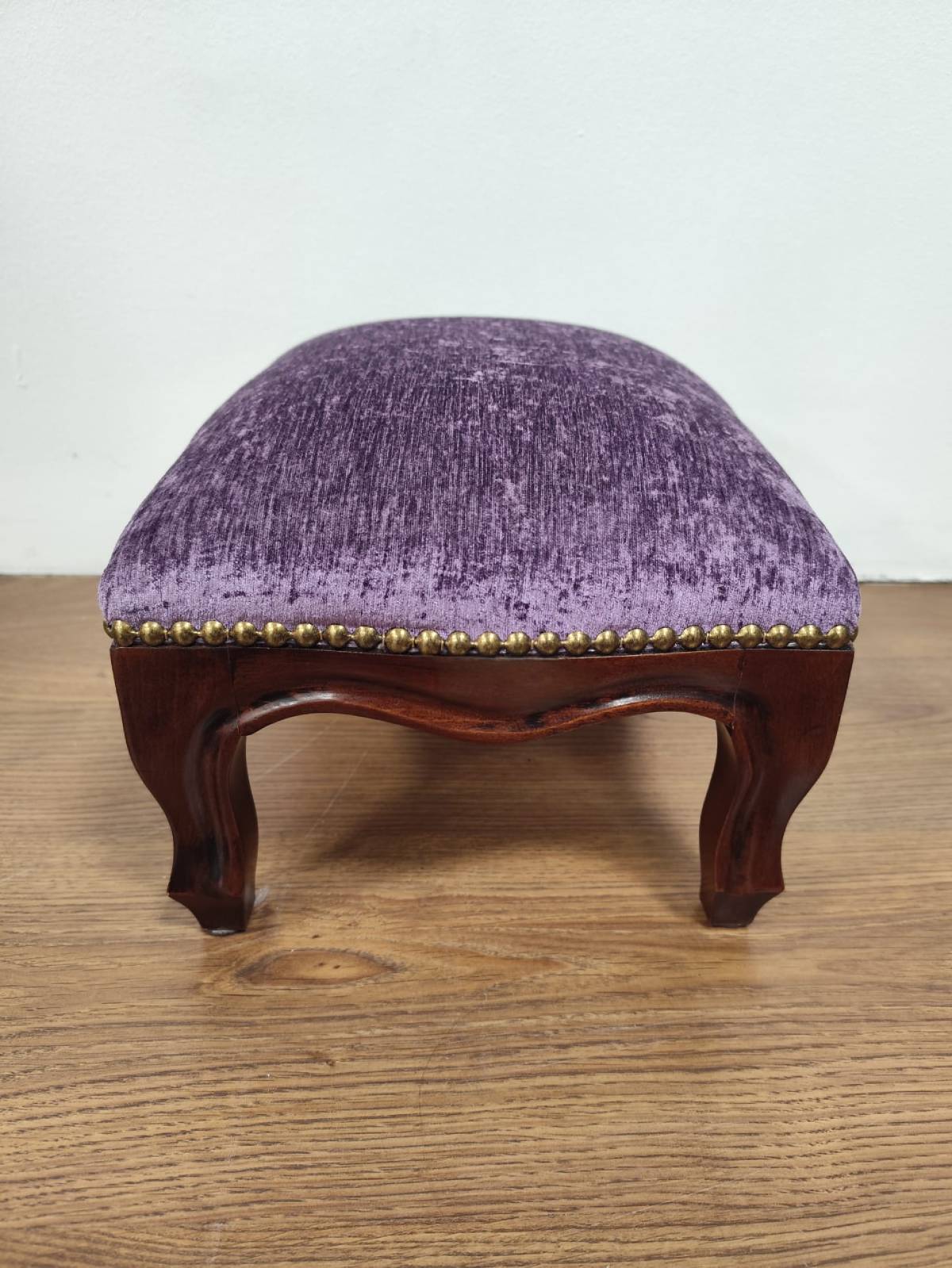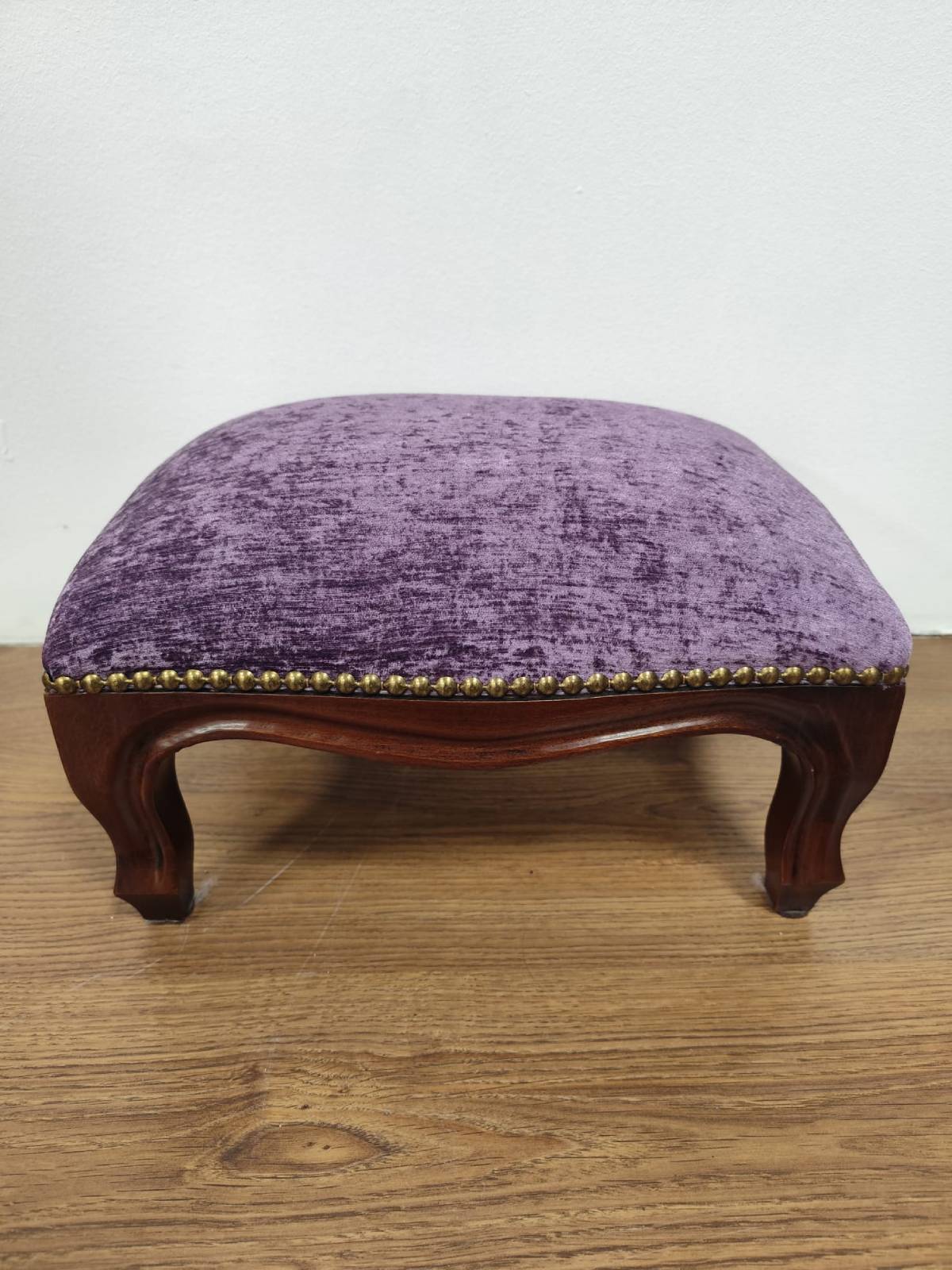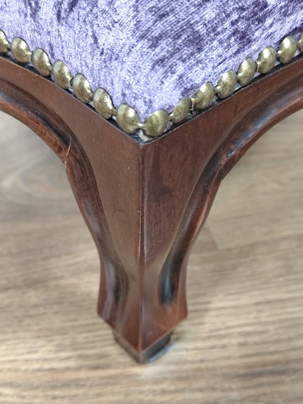 – tapicerka wykonana metodą nowoczesną tzn. gąbka poliuretanowa + pasy tapicerskie + płótno (surówka) + tkanina dekoracyjna fioletowych odcieniach,