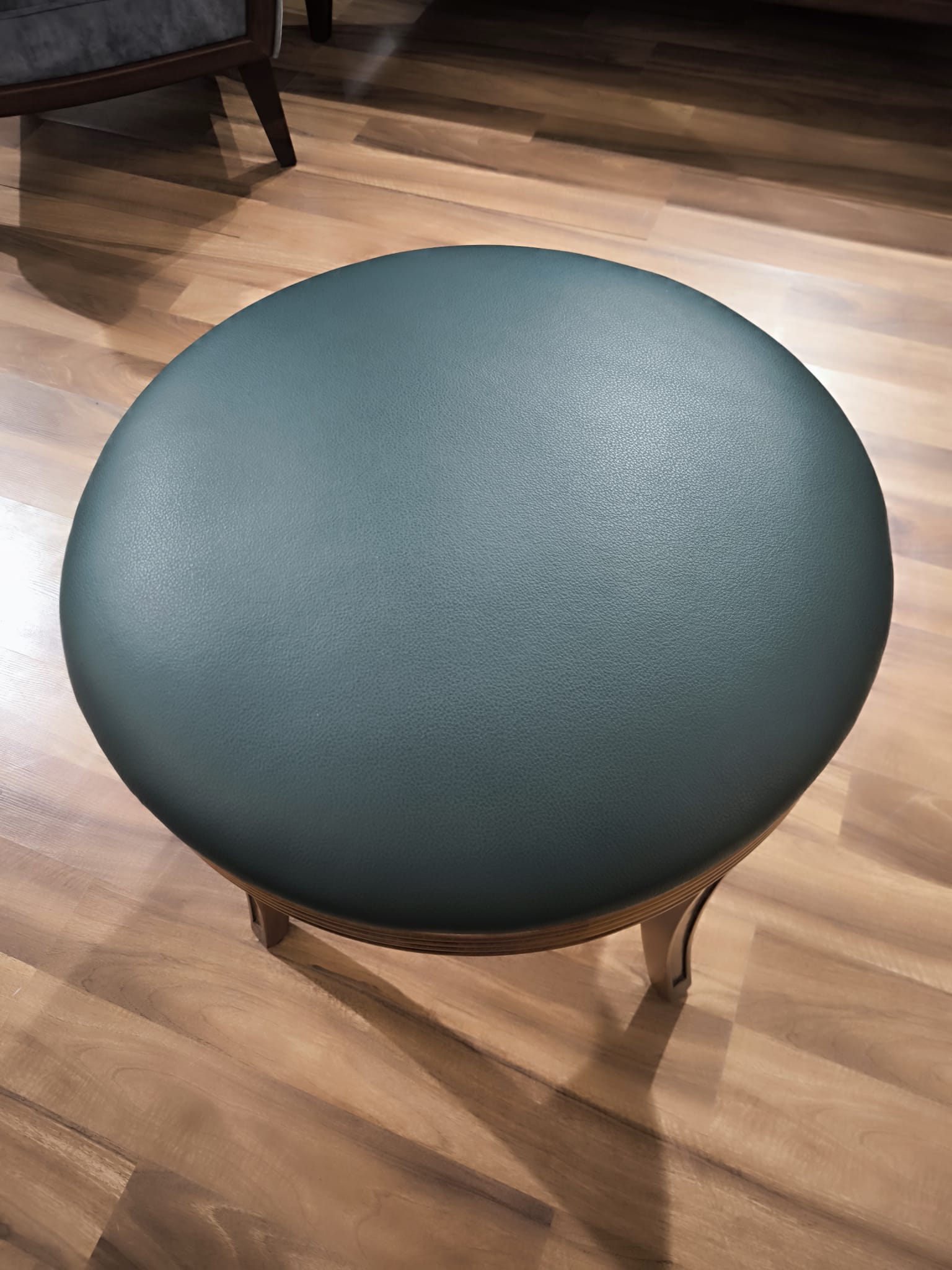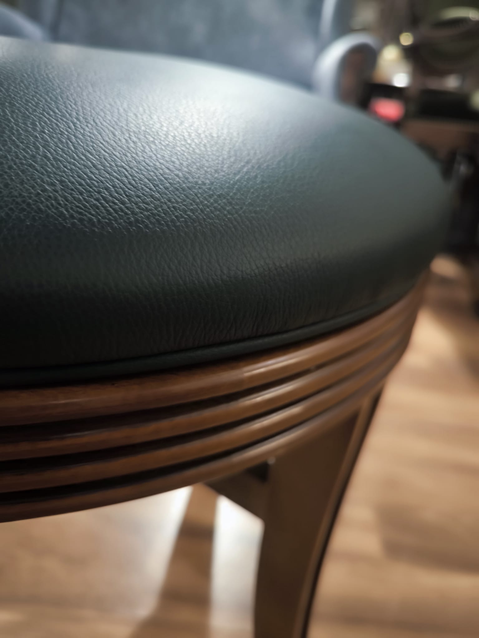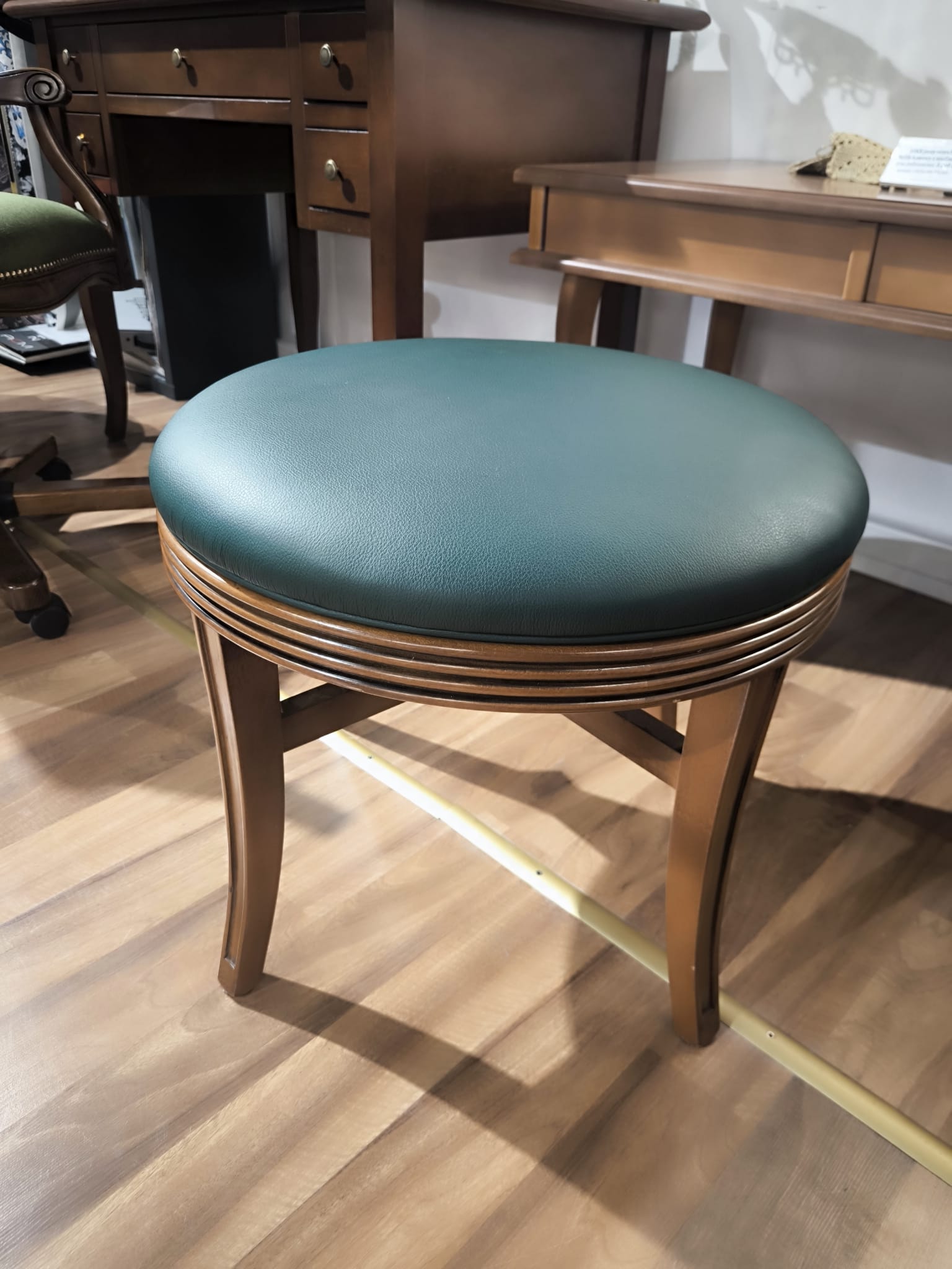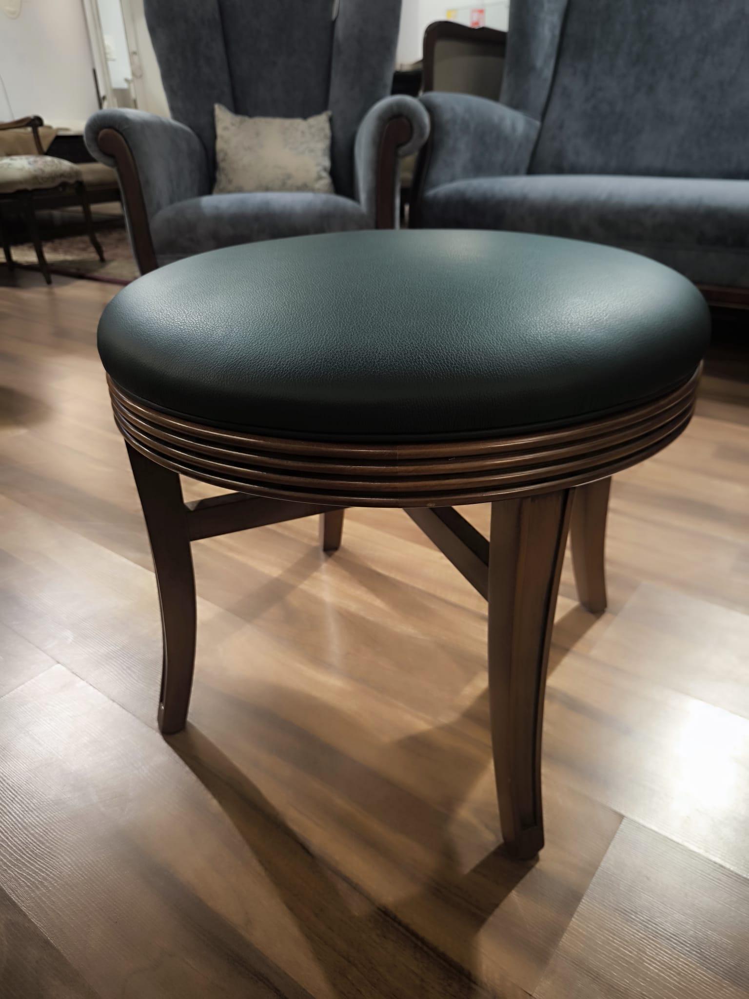 Okrągły puf obrotowy – elegancja w średnim orzechu z tapicerką w skórze naturalnej