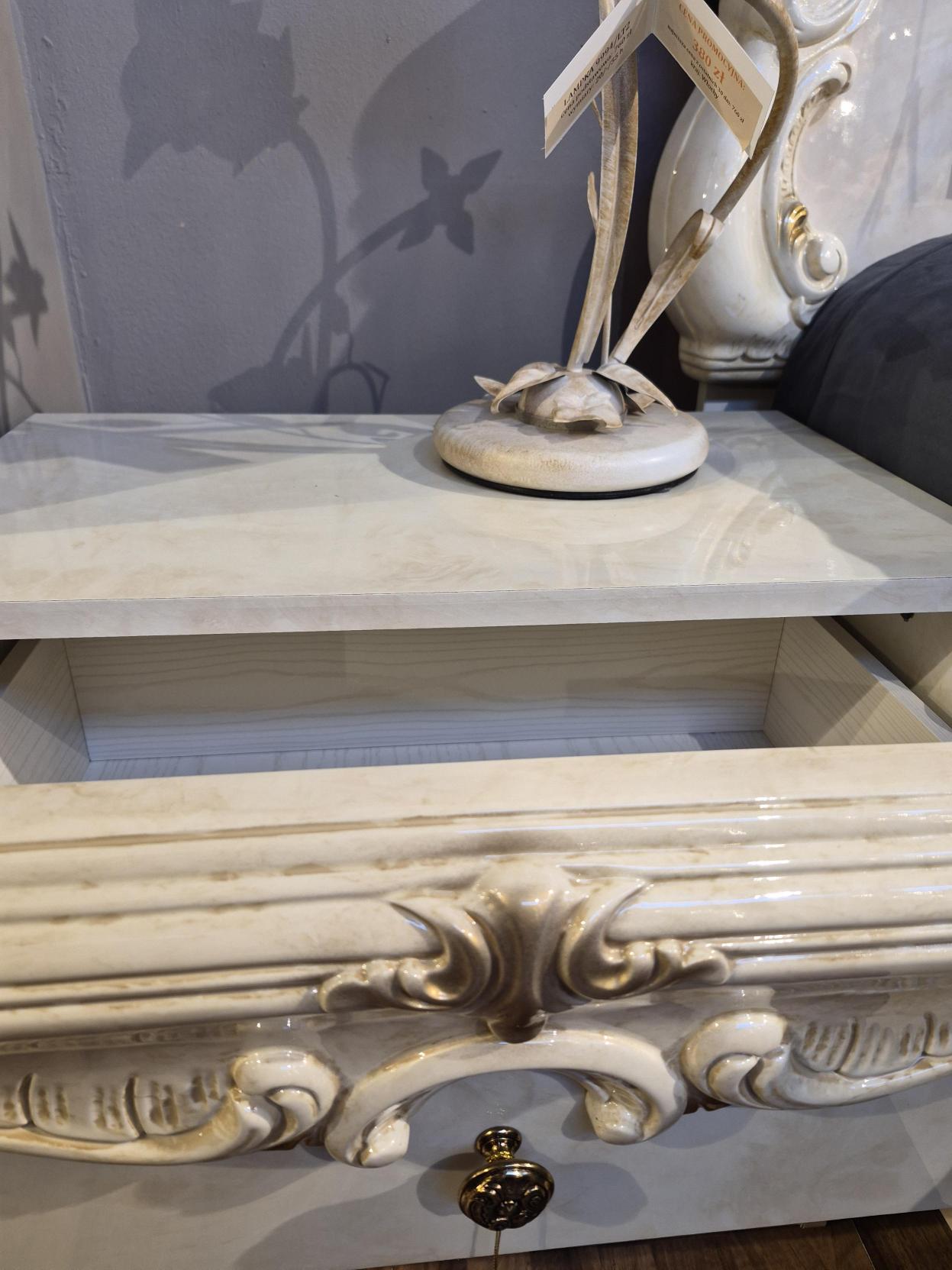 Meble z kolekcji Barocco wykonane są z wysokiej jakości materiałów i wykończone z dbałością o detale. Starannie lakierowane powierzchnie nie tylko podkreślają elegancki charakter sypialni, ale także zapewniają trwałość i łatwość utrzymania w czystości.
