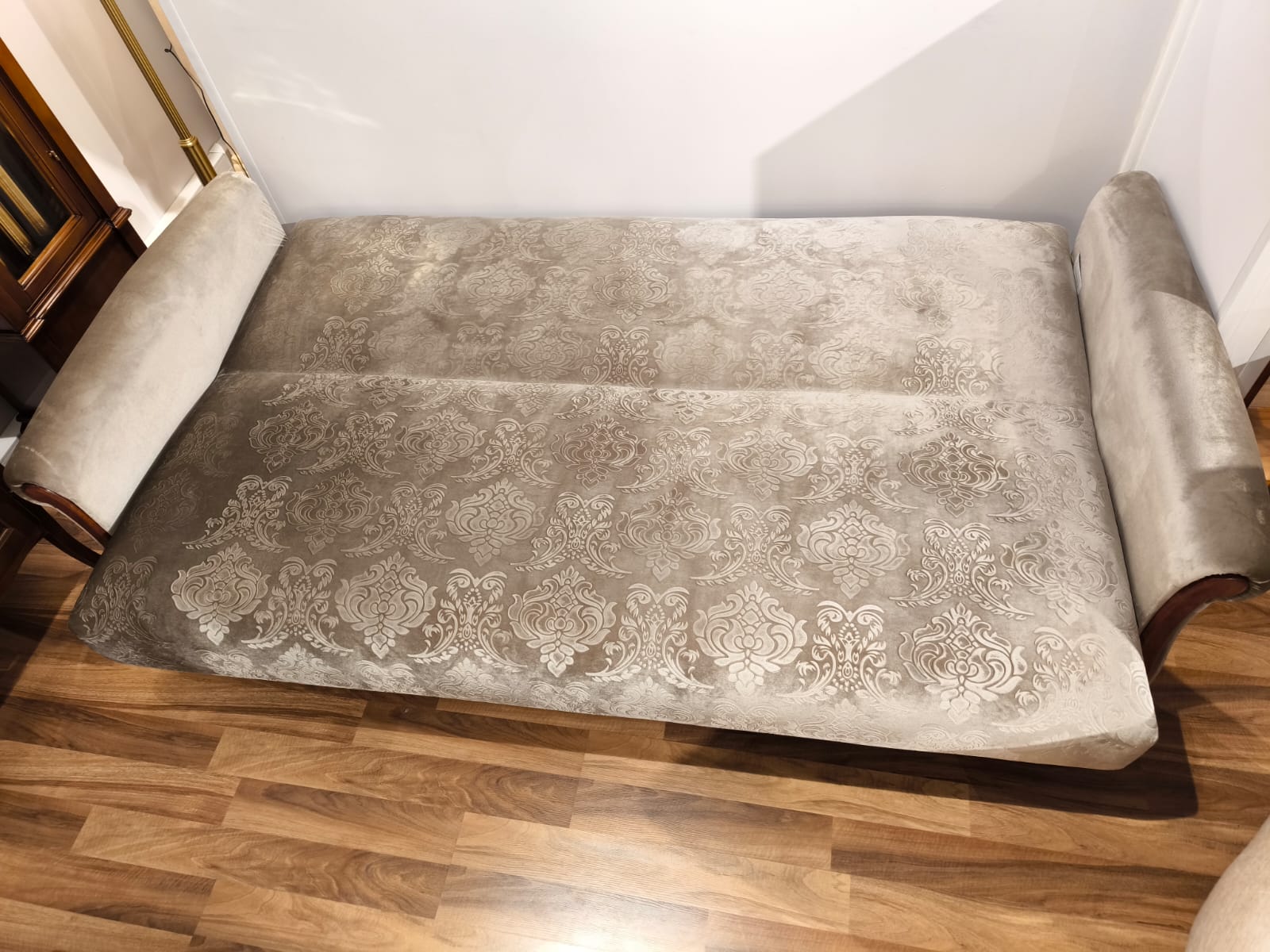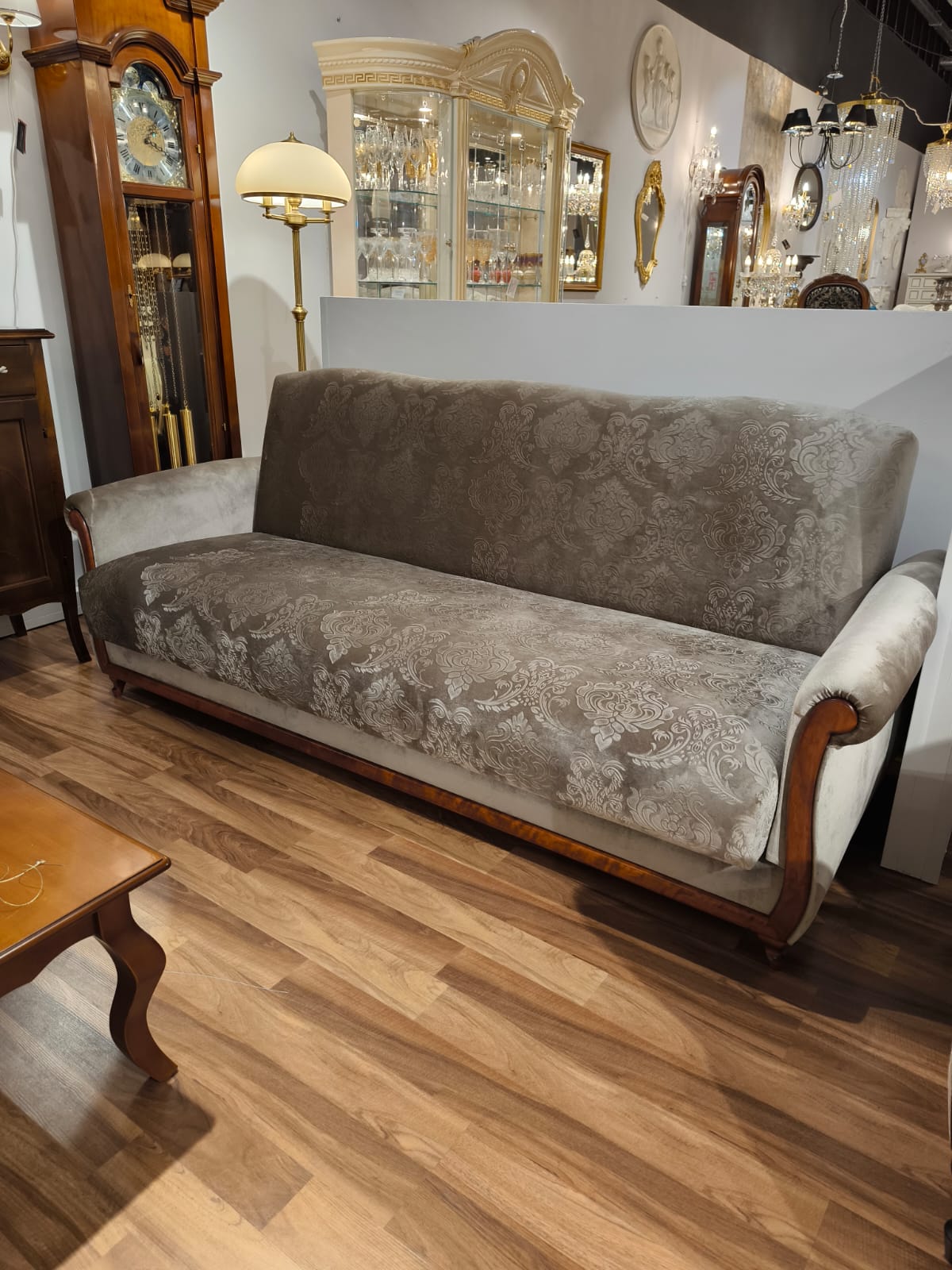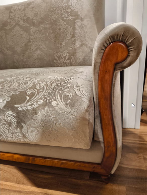 Ekskluzywna wersalka Lirka, produkcji polskiej jest wykonana z litego drewna bukowego. Drewniane elementy wybarwione są w odcieniu jasnego orzecha. Tkanina pluszowa z delikatnym połyskiem w wybarwieniu jasnego chłodnego brązu. Na podłokietnikach i cardze znajduje się wersja tkaniny gładkiej a na siedzisku i oparciu są dekoracyjne tłoczone medaliony.