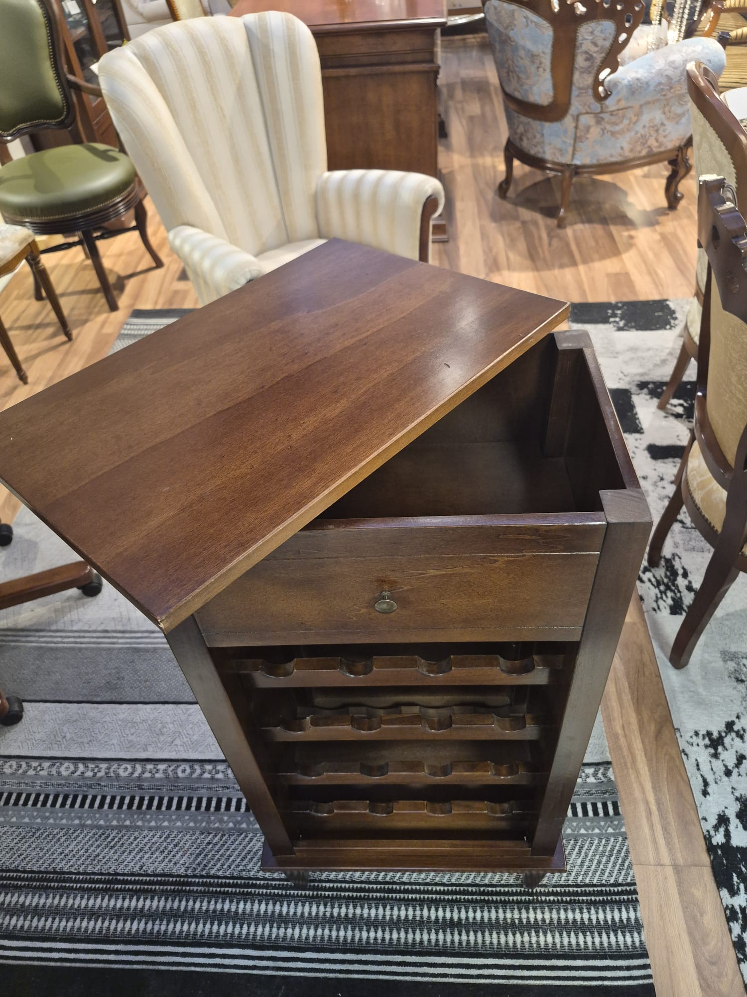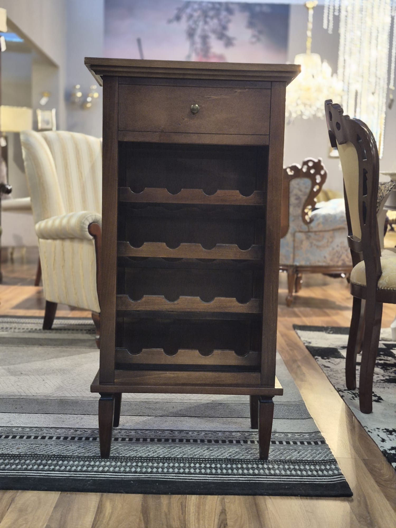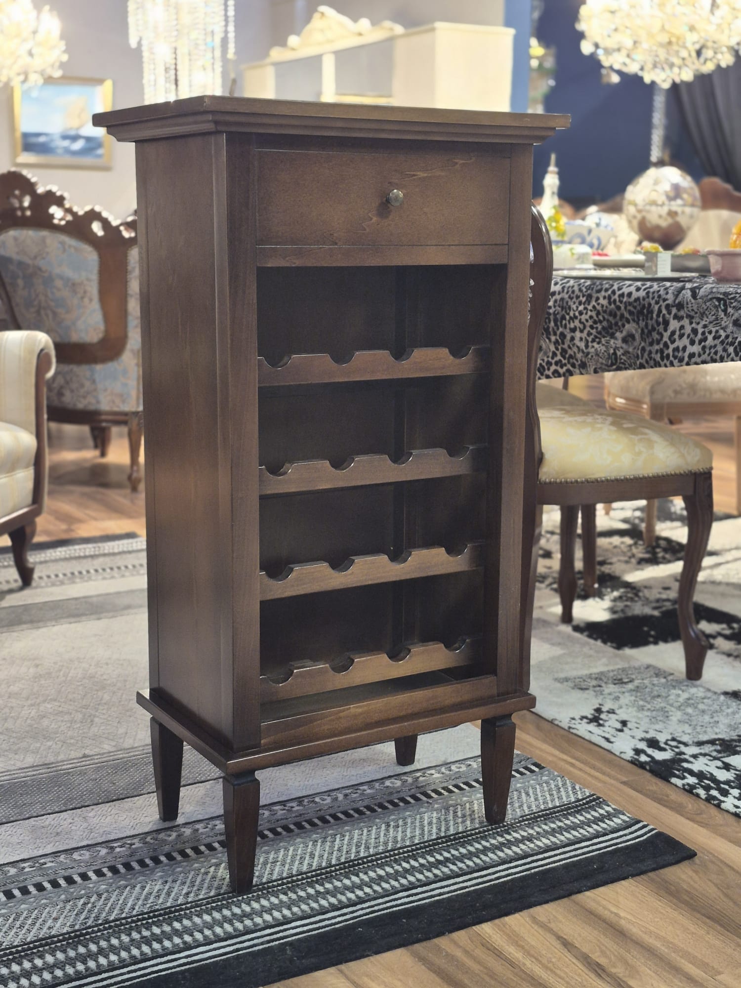 Elegancka włoska szafka na wino LE V1214/A to stylowy i funkcjonalny mebel, który będzie doskonałym uzupełnieniem salonu, jadalni, kuchni czy gabinetu. Jej klasyczny wygląd i staranne wykonanie w naturalnym odcieniu drewna podkreślą charakter wnętrz urządzonych zarówno w stylu klasycznym, nowoczesnym jak i kolonialnym.