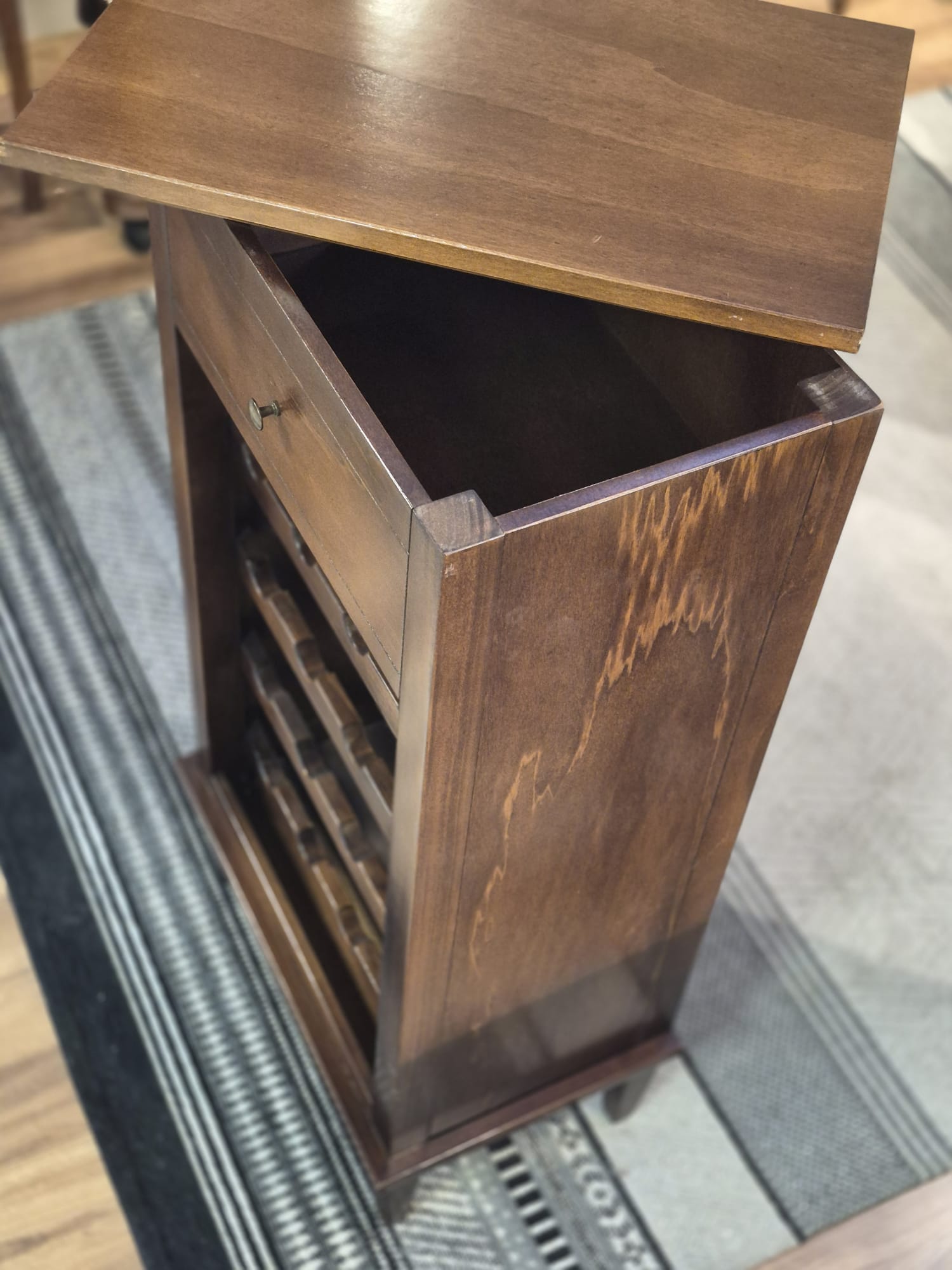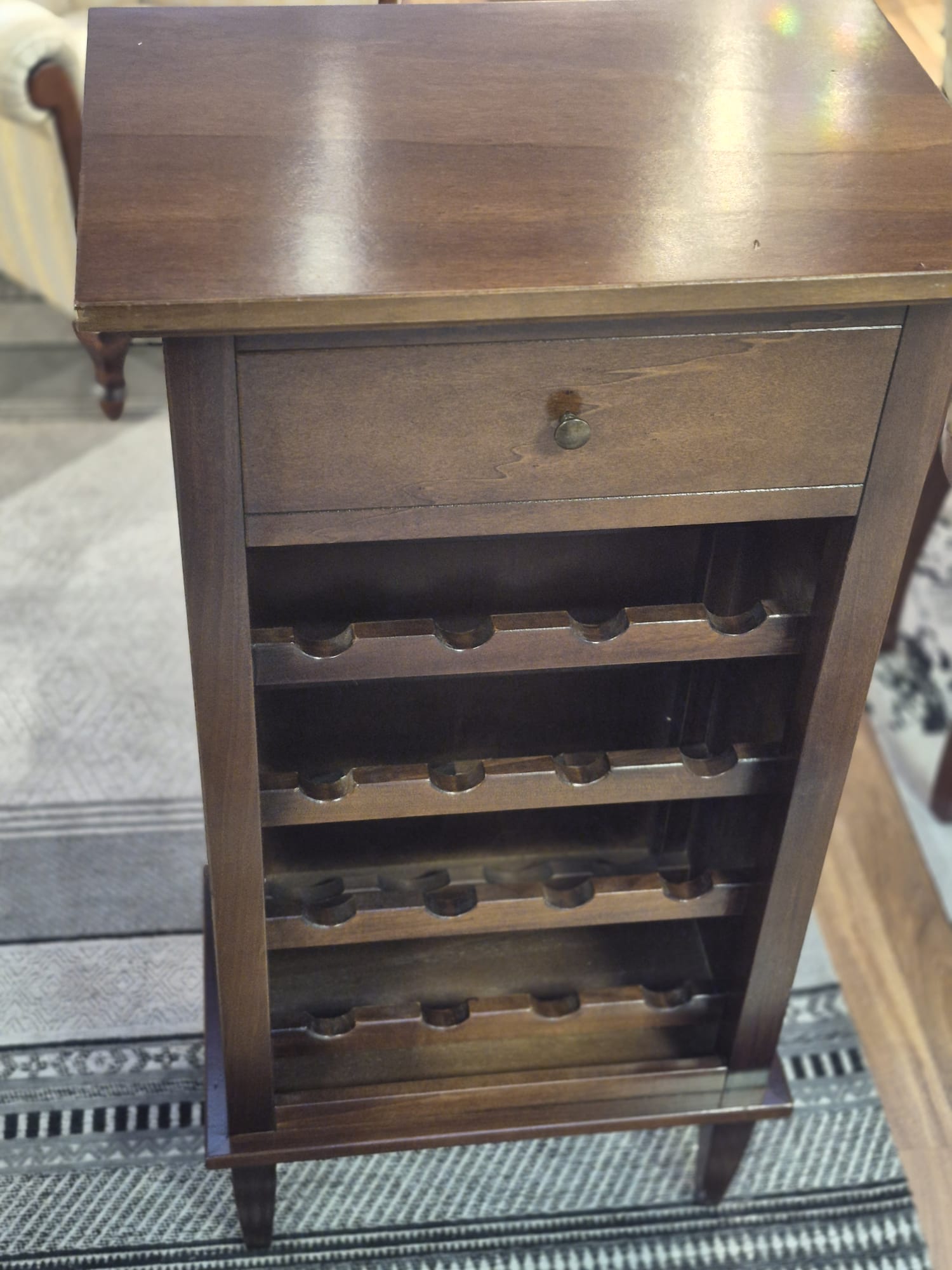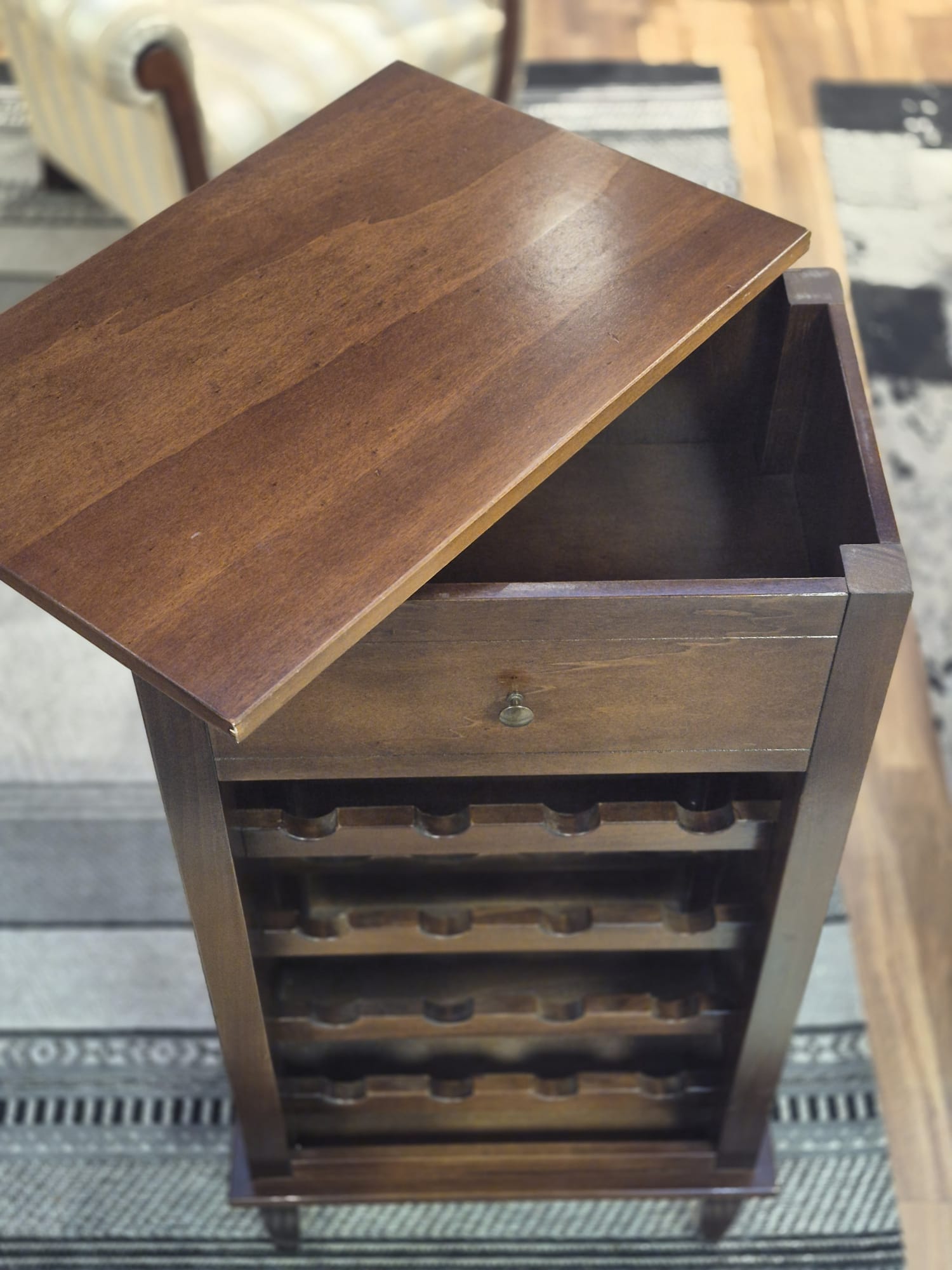 Lekka i stabilna konstrukcja oparta na stylowych nogach sprawia, że szafka wygląda elegancko i z klasą. Doskonale komponuje się z innymi meblami oraz dekoracjami, podkreślając gust i styl właściciela. To mebel, który nie tylko przechowuje wino – tworzy atmosferę wyjątkowego miejsca spotkań.