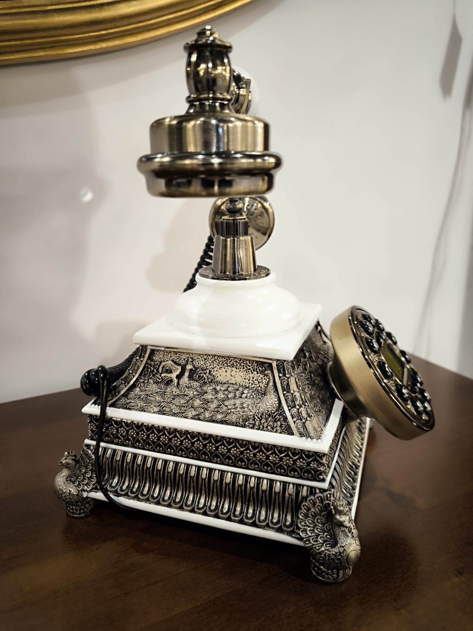 Telefon Madryt w kolorze białym z dekoracyjnymi elementami w kolorze mosiądzu. Telefon stacjonarny, idealny jako gadżet do salonu lub na recepcję.
