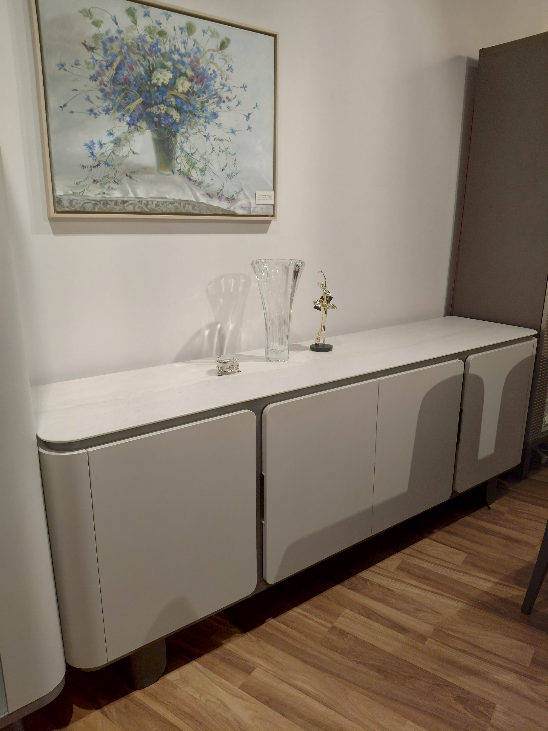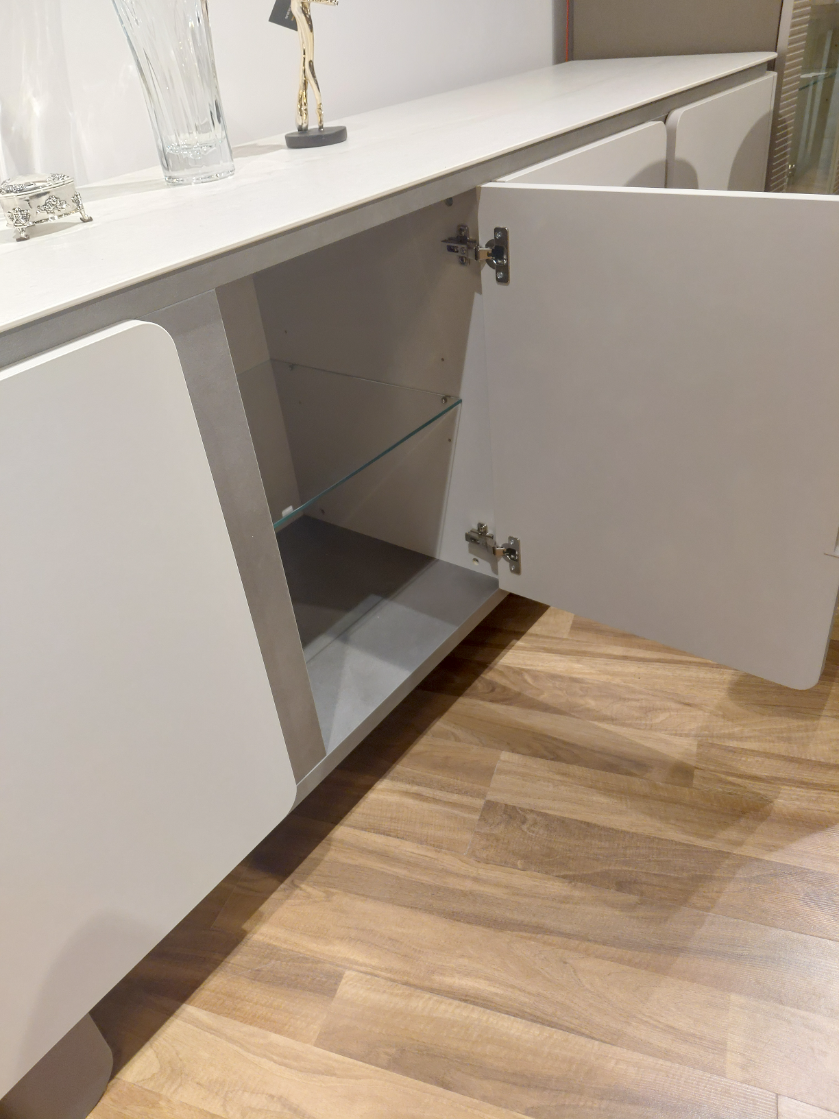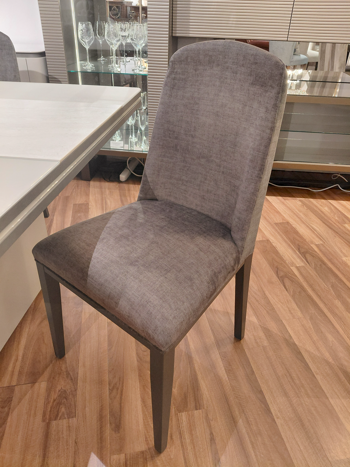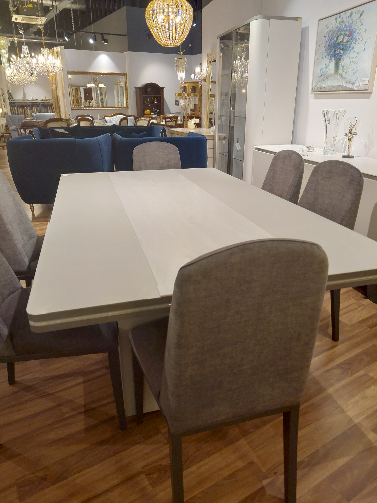 Uzupełnieniem zestawu jest dwudrzwiowa witryna z wbudowanym oświetleniem, czterodrzwiowy bufet oraz 6 wygodnych krzeseł, zaprojektowanych z myślą o komforcie i spójnej estetyce. Fronty mebli wykonano z lakierowanej płyty MDF o matowym wykończeniu, co podkreśla nowoczesny i luksusowy charakter kolekcji. Blaty z gresu polerowanego są nie tylko efektowne wizualnie, ale również trwałe i łatwe w utrzymaniu.