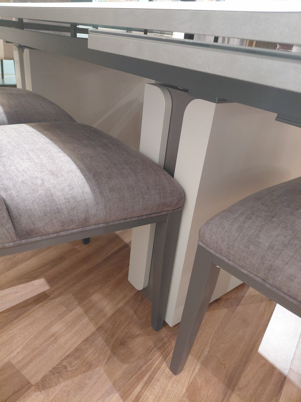 W skład jadalni wchodzi rozkładany stół o długości 200 cm, wyposażony w dwie wkładki po 45 cm, które pozwalają w prosty sposób zwiększyć powierzchnię blatu i komfortowo przyjąć większą liczbę gości. Charakterystycznym elementem stołu są boki ze szkła satynowego, nadające konstrukcji lekkości, oraz centralna wstawka z gresu polerowanego imitującego trawertyn, idealnie komponująca się z całością.