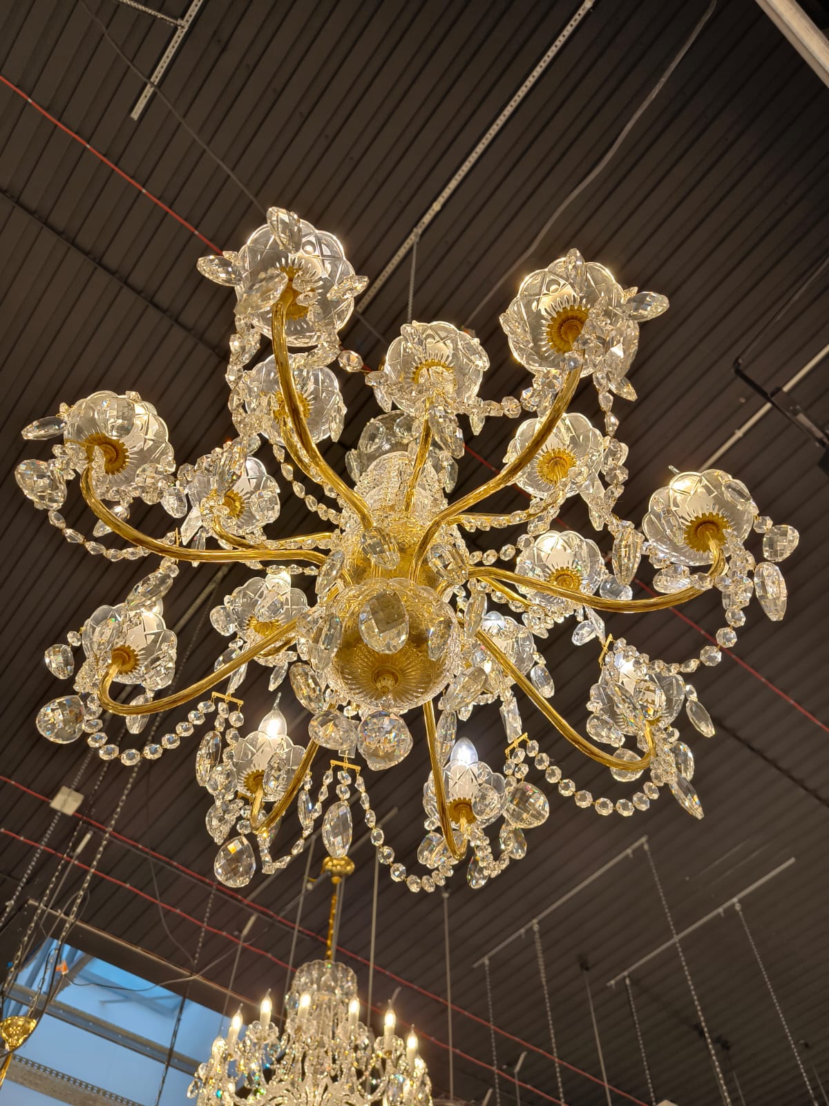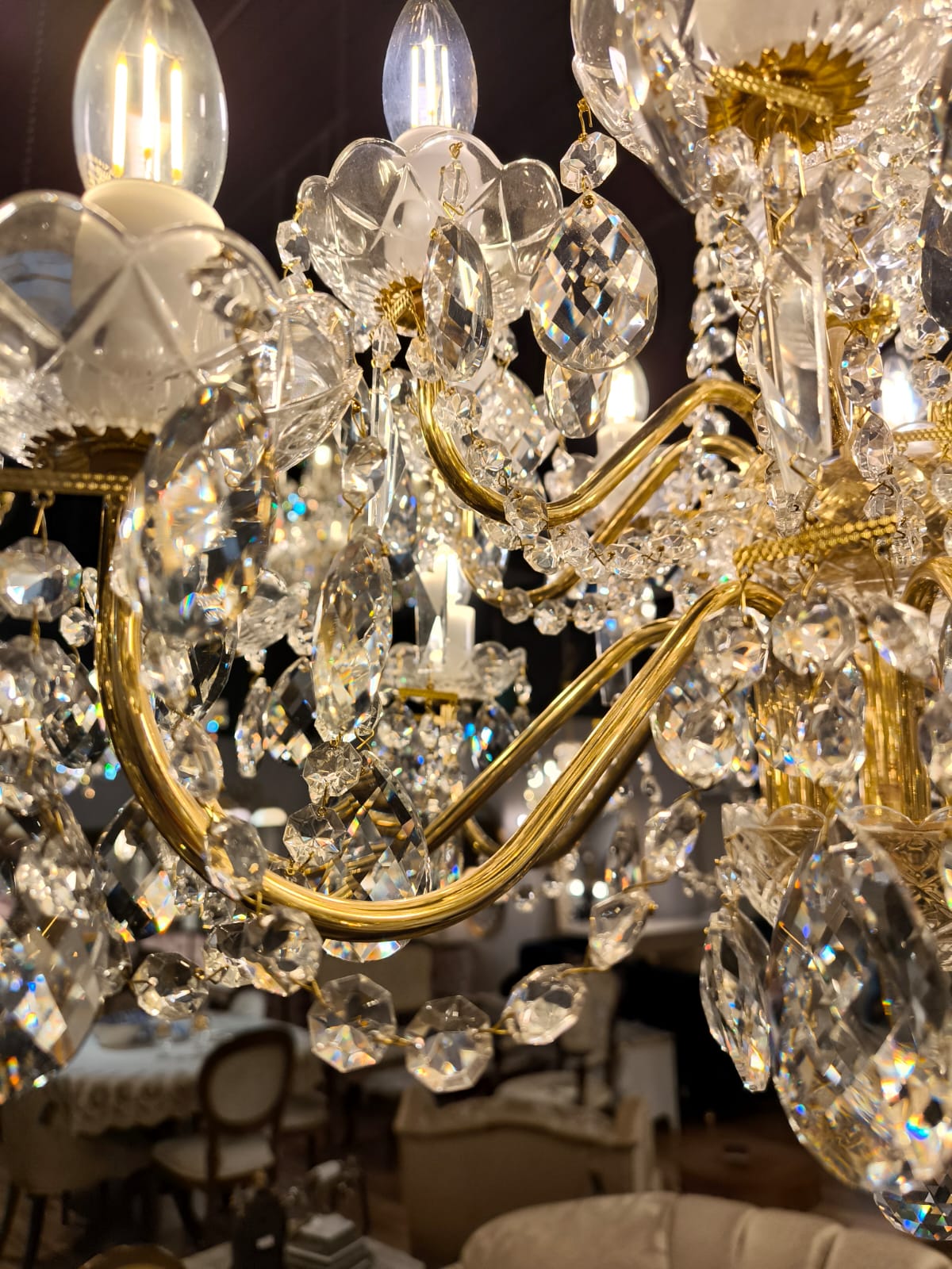 94/2 Żyrandol kryształowy na podstawie mosiężnej, w kolorze złota w połysku. Dwupoziomowy z mosiężnymi ramionami.